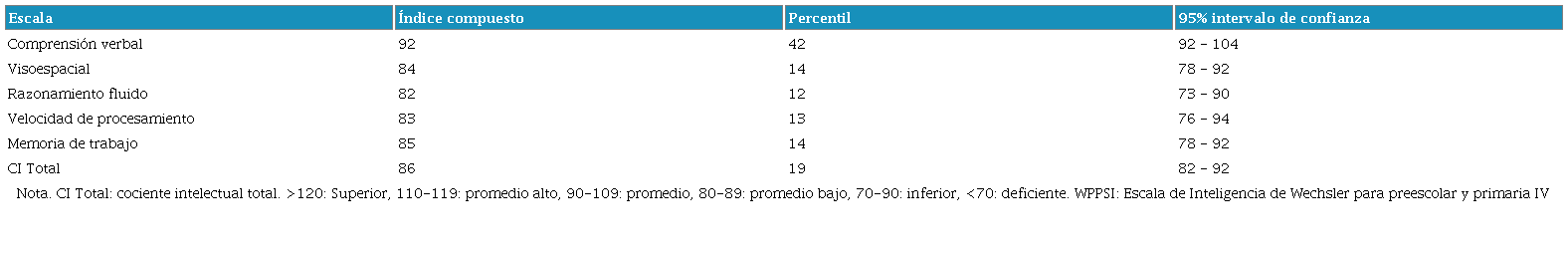 En la Escala de Inteligencia de WPPSI IV [17] obtuvo un puntaje de inteligencia de 86 puntos, el cual se interpreta como promedio bajo. Descartando discapacidad intelectual, en la batería ENI [18] se encontraron resultados entre 0 y -1 derivadas estándar en todos los componentes excepto en atención, en la que sus hallazgos estaban por debajo de -2 derivadas estándar, considerándose estadísticamente significativa.