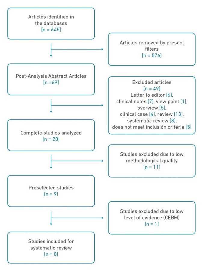 At the end of the selection of the first search, a total of 645 articles were obtained (PubMed, 74; SCOPUS, 185; EBSCO, 76; Nature, 310). After going through the different filters, 69 articles remained for analysis (PubMed, 23; SCOPUS, 20; EBSCO, 22; Nature, 4). De these were excluded 49 for not meeting criteria, leaving 20, to which evaluation of the methodological quality was made, leaving 9 preselected. We excluded 1 and selected 8 for the present review (Figure 1).