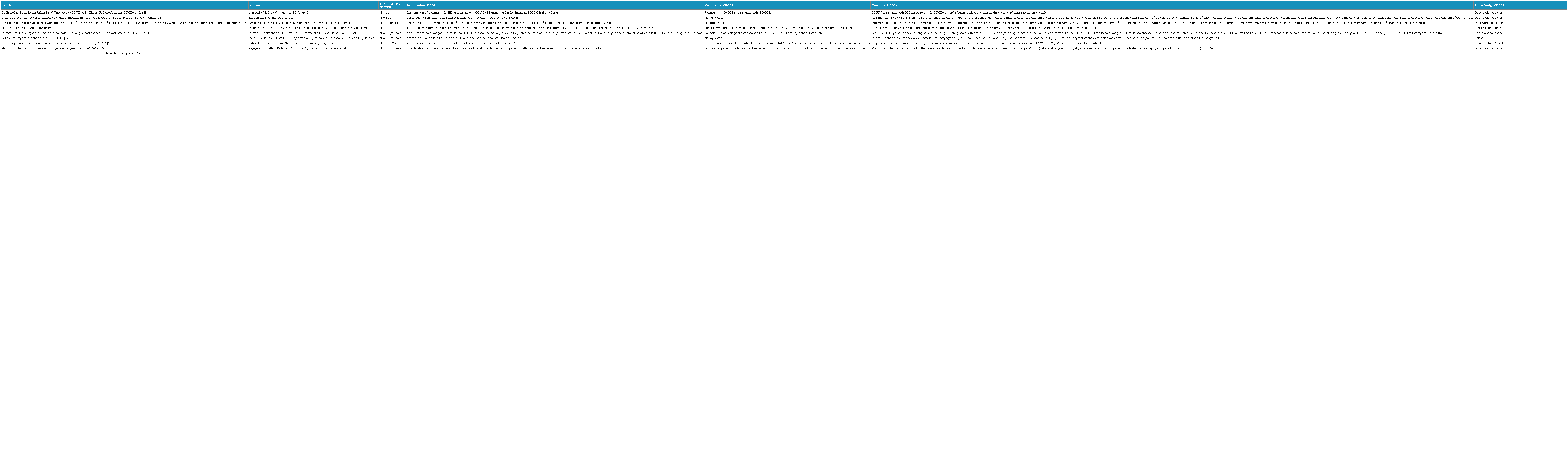 The objective of Agergaard et al. [19] was to investigate peripheral nerve and electrophysiological muscle function in 20 patients with persistent neuromuscular symptoms after COVID-19. Results included reduction in motor unit potential in the biceps brachii, vastus medial and tibialis anterior, compared to control (p < 0.0001); physical fatigue and myalgia, compared to the control group, was more common in patients with electromyography (p < 0.05).
