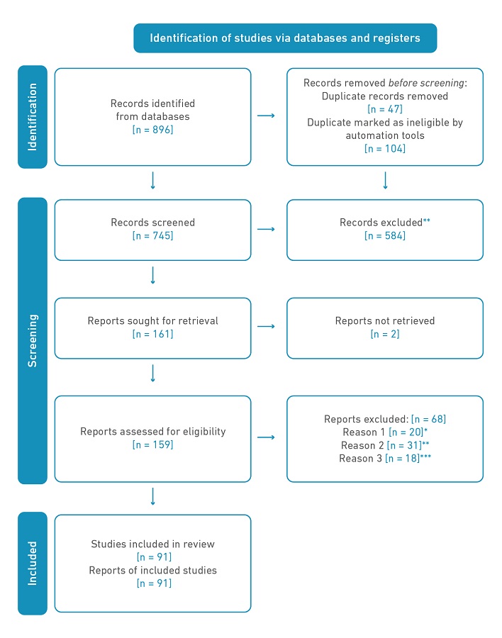 Once the search chain was executed, 896 records distributed in the different databases were identified. By applying the automatic filters of the search tool (time range, complete articles, original articles, English language, disciplinary areas of interest) and excluding duplicates, the titles and abstracts were screened to proceed to a review of the full text. After assorting these filters, the articles included for the review and analysis comprised 91 studies (see Figure 1). In Appendix A, you can consult the descriptive matrix in which the main characteristics of each study are summarized.