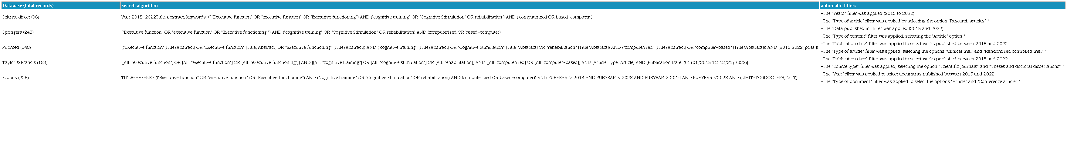 To identify potentially relevant documents, the following bibliographic databases, resource sources, and digital platforms were searched: Science Direct, Scopus, Springer Link, PubMed, and Taylor & Francis. The research team designed and tested the search strategies and reviewed them with a specialized professional. In the review protocol, the authors established the central concepts for the construction of the search chain of the studies: 1) Executive functions, 2) Rehabilitation and cognitive stimulation, 3) Computer systems, and 4) young and middle adulthood. These categories were translated into English and reviewed in the ERIC thesauri (recognized terms in education and health from the Educational Resources Information Center). Based on these central concepts identified and the review carried out in said thesauri, a search chain was built that included logical operators, which was executed in October 2022 in the databases selected for the search of the articles. The final search strategy for each database is presented in Table 1.