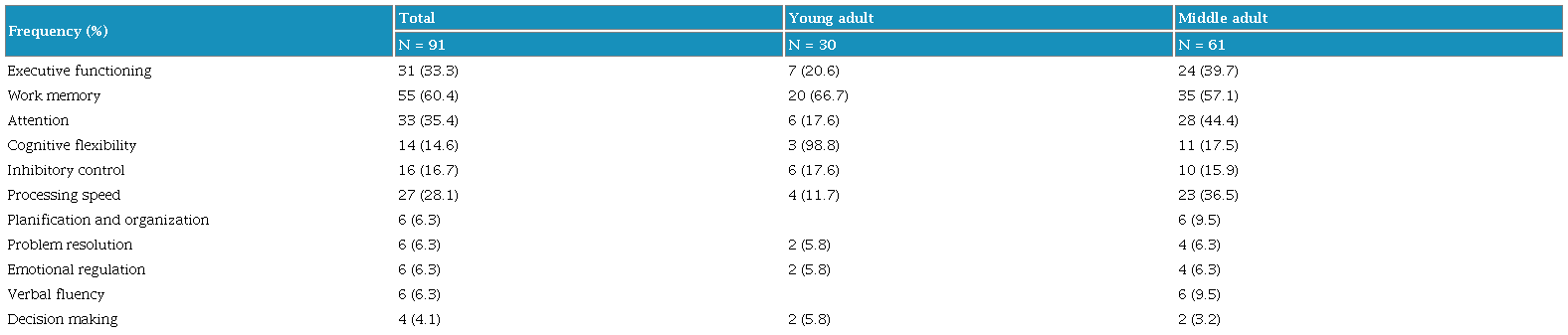 To present the results, young adults (between 18 and 30 years) and middle-aged adults (between 31 and 60 years) were discriminated against. As seen in Table 2, most of the studies on young adults were conducted in a healthy population, with most of the participants being university students. Most of the clinical population of this population range had a diagnosis of schizophrenia or depressive disorders. The studies in average adults were mainly in the clinical population, where the most frequent pathologies were disorders associated with the schizophrenia spectrum (21.8%) and multiple sclerosis (18.2), to a lesser extent, consumption disorders of substances (10.9%) and cerebrovascular accidents.