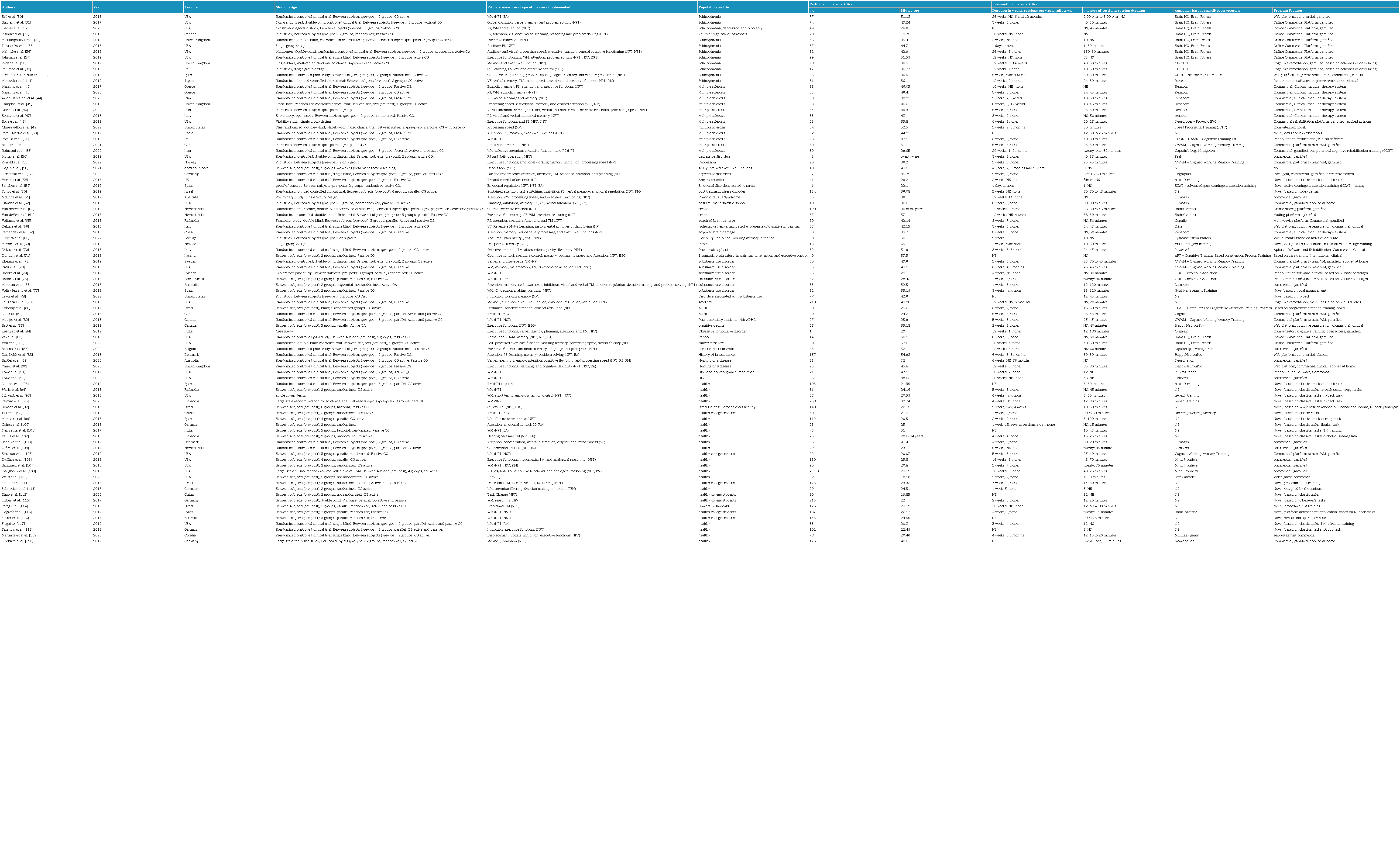 Among the populations with the most studied clinical conditions in young and middle adults were multiple sclerosis [42-50,53], schizophrenia [30-39,41,67], acquired brain injury [63-65,67,69,70], substance use disorders [72-78], and depressive disorders, [32,54-57,78] and a minority of studies were conducted in young adults with Huntington's disease [89,90], stress-related emotional disorders [59-62], and cancer survivors [80,86-88]. Many of these studies evaluated the effects of interventions on the executive functions of sustained attention, concentration, and speed of information processing.