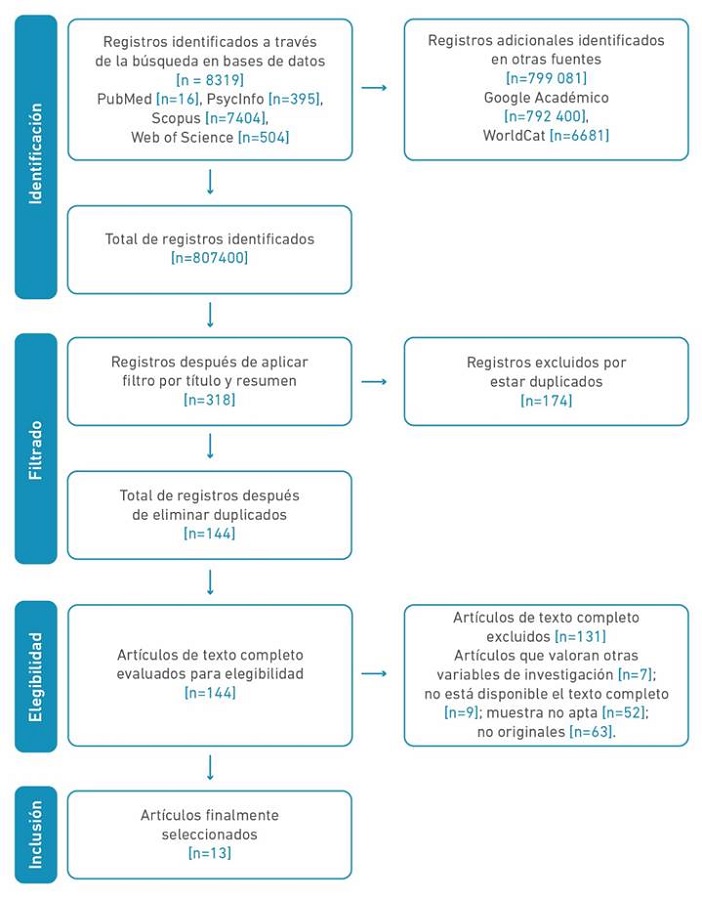 Metodología: Se realizó una revisión sistemática de la literatura y para reportar la evidencia se utilizó la versión 2020 de la declaración Prisma. Las bases de datos consultadas fueron Scopus, Pubmed, Web of Science y PsycInfo. En la búsqueda también se incluyeron bases de datos de literatura gris como Google Académico, Open Gray y WorldCat.