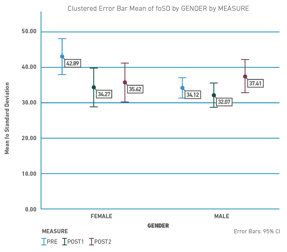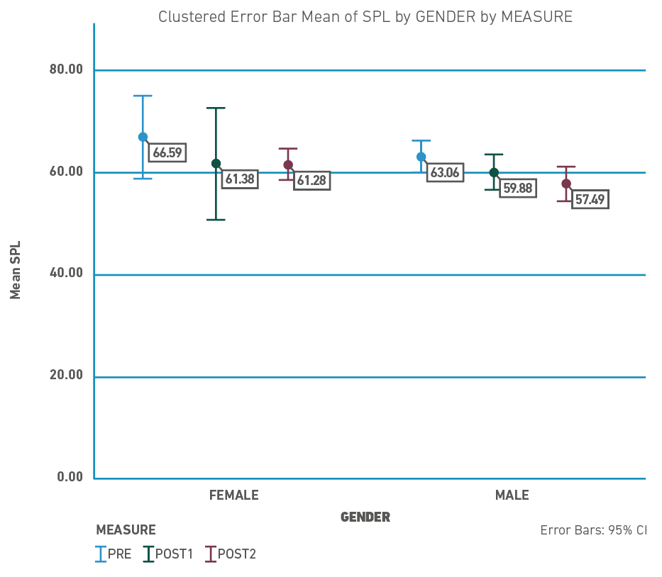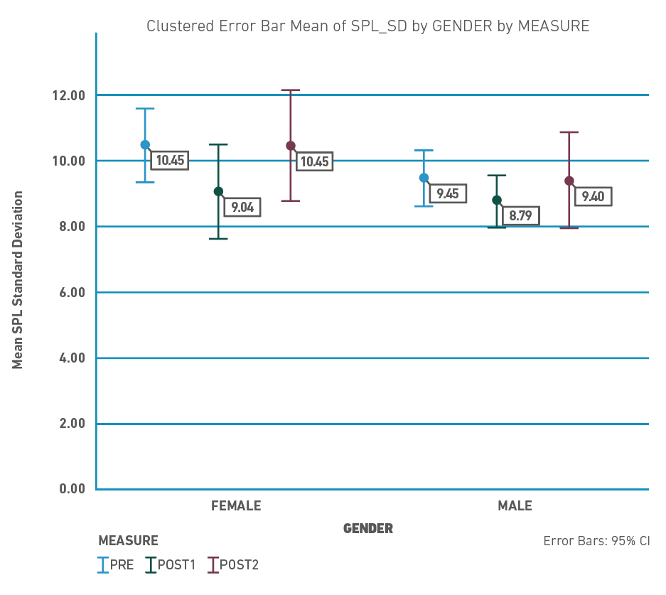 Figure 3 shows the mean values of Sound Pressure Levels (SPL) per gender during the three assessments. Both groups tended to decrease their SPL, but this tendency was more consistent among males (around 2 dB in every measure) compared to females (5 dB in the first measure, 0.10dB in the second measure). Concerning the SPL SD, Figure 4 shows that both groups had a decreased SPL SD in the first follow-up measure, but this tendency did not remain towards the end of the follow-up.