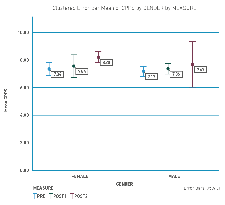 Regarding Cepstral Peak Prominence Smoothed (CPPS), as shown in Figure 5, there was a tendency in both groups towards increasing this parameter comparing the baseline measure with the post-intervention measure.