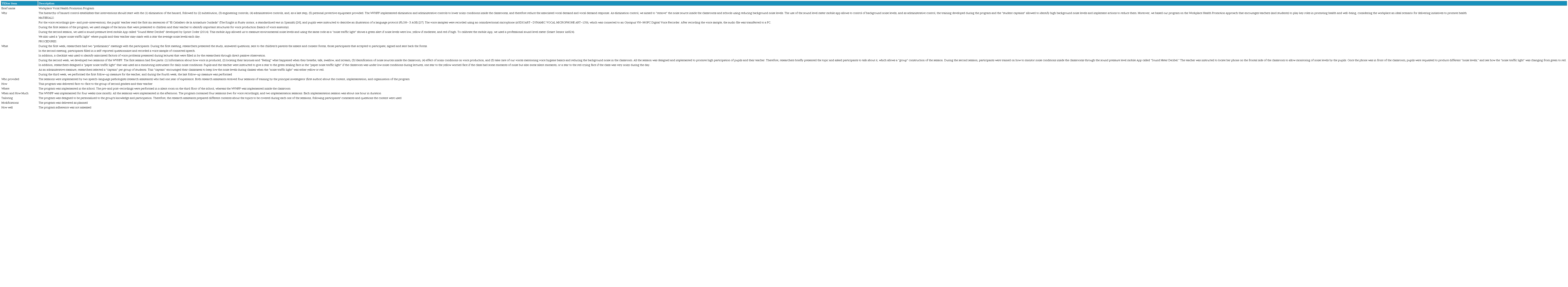 The WVHPP was designed with two primary goals in mind: to reduce noisy conditions inside the classrooms that may cause loud voice production, which has been found associated with voice disorders among teachers and students, and to increase awareness about the effect of background noise on voice production. To achieve these goals, this program was delivered face-to-face in the actual classrooms where classes occurred, and all sessions were conducted in the afternoon. To accommodate school policies and the schedules of teachers and students, the WVHPP had a total duration of four weeks, including a follow-up measurement. Despite the program's relatively short duration, we ensured that all essential components and activities were included to guarantee its effectiveness in enhancing the voice health of participants.