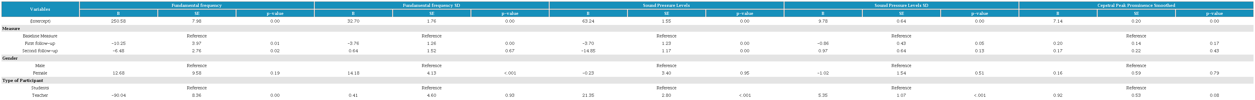 Regarding the effect on fo standard deviation (SD), there was a decrease in this parameter in the first follow-up (B= -3.76), but the effect did not remain by the end of the follow-up. Gender was statistically associated with this parameter (B= 14.18), whereas the type of participant was not an associated factor (p-value >0.05).