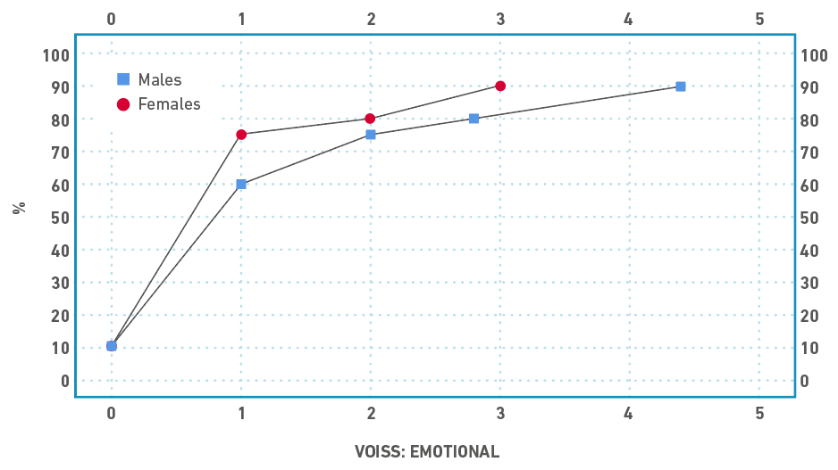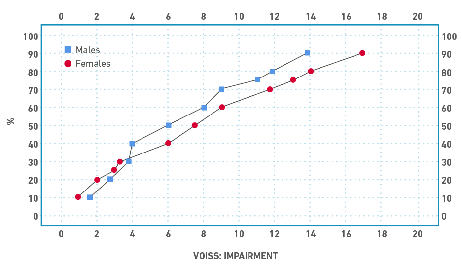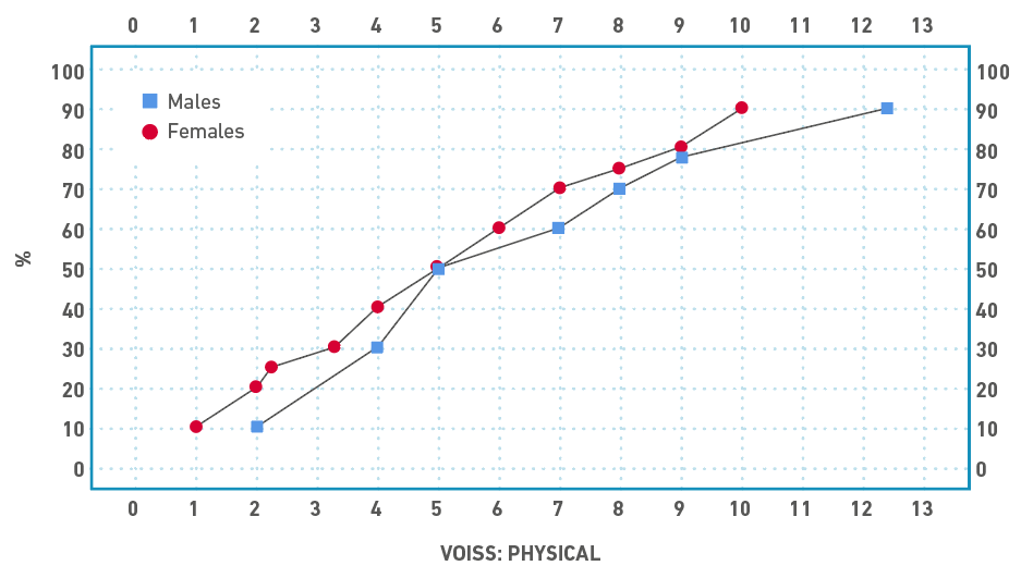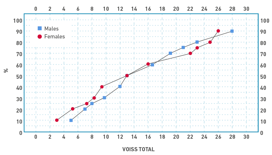 Transformation into percentile scores was performed using the percentile range procedure [25] which has been regarded as the easiest and more direct procedure, offering accurate adjustment to the accumulated percentages. Table 3 shows percentile scores for each of the three subscales of the VoiSS scale. For higher precision, percentile scores are displayed separately for women and men, given the obtained effect sizes. Percentile graphs are included for the total scores (Figure 1), scores in the Impairment subscale (Figure 2), scores in the Emotional subscale (Figure 3), and scores in the Physical subscale (Figure 4).