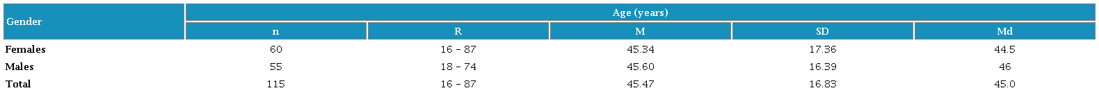 Participant age distribution by gender (see Table 1) did not show statistically significant differences (p > .05) between women and men, with mean scores 45.34 (SD = 17.36) and 45.60 (SD = 16.39) years, respectively. The other descriptive statistics for age also showed very similar scores between men and women.