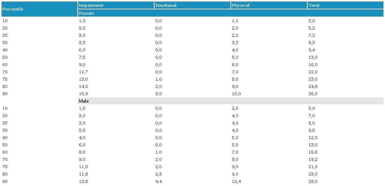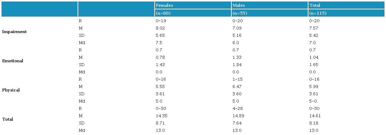 Mean scores were 14.61 (SD = 8.18) for the total scale, 7.57 (SD = 5.42) for the Impairment subscale, 1.04 (SD = 1.65) for the Emotional subscale, and 5.99 (SD = 3.61) for the Physical subscale.