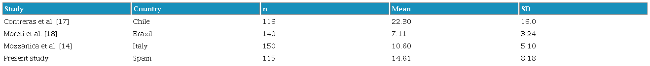 The obtained normative values can be compared with those found in other validation studies for the VoiSS scale [15-17]. Table 4 shows the results reported in these other studies, including the country, the sample size, the mean score, and the standard deviation. The mean value of the total score for the VoiSS found in this study is in the intermediate zone of the values reported in other countries. In this regard, the study by Contreras et al. [20] reports the higher score (M = 22.30, SD = 16.0), a finding that the authors attribute to a cultural difference so that Chilean patients consider their voices as normal, in spite of the presence of small vocal alterations. A similar explanation could be used to interpret the mean scores reported here, although further investigation should address this hypothesis.
