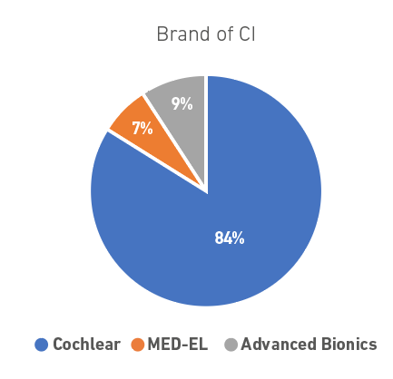 Most of the participants were white (95%), over the age of 50 (72%), and female (93%), as shown in Table 1. The majority of the participants also had some college education: associate degree (7%), bachelor’s degree (40%) or postgraduate degree (42%). Most participants reported having gradual hearing loss (74%) and were diagnosed with hearing loss when younger than 30 years old (60%), as seen in Figure 1. The mean age of hearing loss diagnosis was 27 years; thus, many participants can be considered to be post-lingually deaf. In relation to which cochlear implant brand they used, most participants had Cochlear (84%), with only 9% wearing Advanced Bionics and 7% wearing MED-EL implants, as demonstrated in Figure 2. Regarding mode of implantation, 53% had bilateral implants, 30% were bimodal users and one participant had a hybrid implant.
