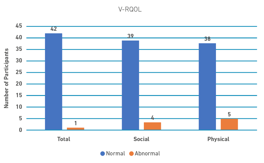 The V-RQOL has a total score, a social-emotional domain, and a physical-functional domain. As shown in Figure 3, for the total score, only one participant had an abnormal score and 42 had scores within normal limits with a mean score of 93.6. In the social domain, four participants scored abnormally and 39 were within normal limits with a mean score of 95.3 and in the physical domain five participants scored abnormally with 38 within normal limits with a mean score of 92.4. Overall, most responses were consistent with no problem with their voice. However, both Question One “I have trouble speaking loudly or being heard in noisy situations” and Question Nine, “I have to repeat myself to be understood,” had 10 or more responses, indicating a small amount to a lot when rating the amount of the problem. No participants indicated that their voice problem was as “bad as it can be.”