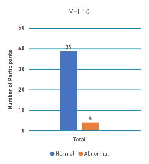The VHI-10 was similar in that only four participants received an abnormal score (see Figure 4 below). For the VHI-10, there were more varied answers across the scale. While the majority of responses were the lowest item on the scale, zero (Never), most questions had at least seven responses of one (Almost Never) or above. Question Two, “People have difficulty understanding me in a crowded room,” had eight responses of one (Almost Never) and nine responses of two (Sometimes) and question one, “My voice makes it difficult for people to hear me” had seven responses for both one (Almost Never) and two (Sometimes). Question Five, “My voice causes me to lose income,” was the only question to receive a response of five (Always) and it only had two responses above zero (Never).