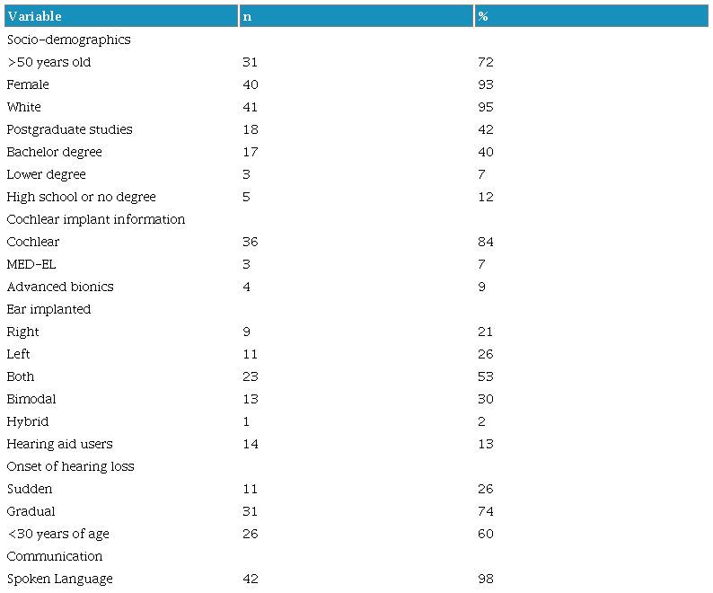 Enfoque: Cuarenta y tres usuarios de IC respondieron a una encuesta sobre su demografía, detalles sobre su IC, la Hearing Health Quick Test (HHQT), la Voice Related Quality of Life (V-RQOL) y el Voice Handicap Index-10 (VHI-10). Las respuestas de la encuesta se analizaron mediante un análisis de regresión lineal univariado.
