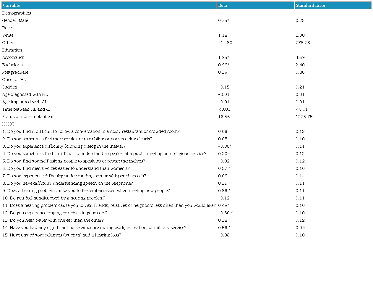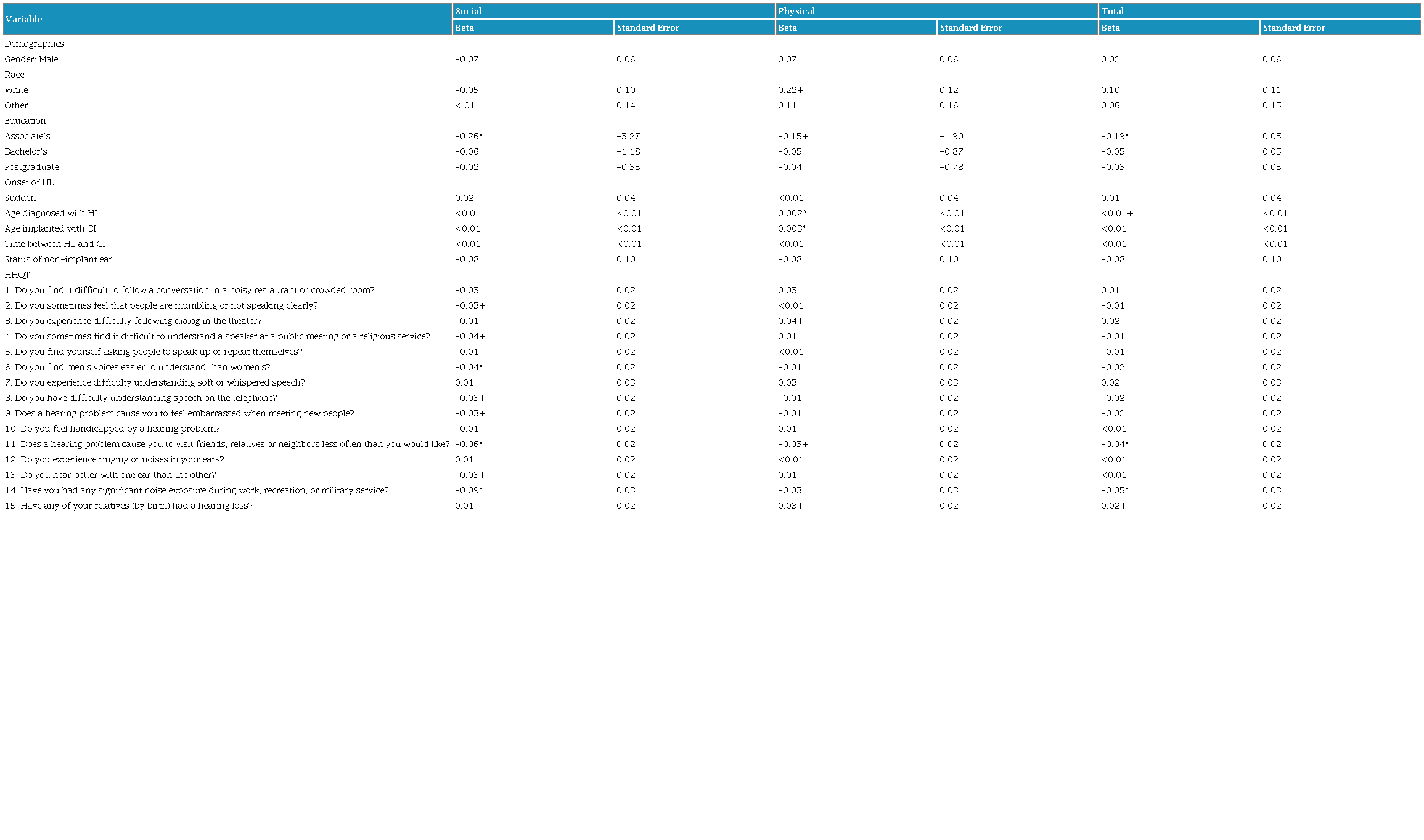 For the physical domain, scores were significantly associated with age diagnosed with hearing loss (β=0.002), and age when implanted (β=0.003) and there were no detectable relationships with race (white) (β =0.22), having an associate degree (β = -0.15). There were no detectable relationships between the physical domain and HHQT three (Do you experience difficulty following dialog in the theater?) (β = 0.04), question eleven (β = -0.03), and question fifteen (Have any of your relatives (by birth) had a hearing loss?) (β = 0.03). Total V-RQOL scores were significantly associated with an associate degree (β =-0.19), HHQT eleven (β =-0.04) and 14 (β=-0.05). Factors with no detectable relationships with the total V-RQOL scores were Age diagnosed with hearing loss (β <0.01), and HHQT fifteen (β = 0.02).