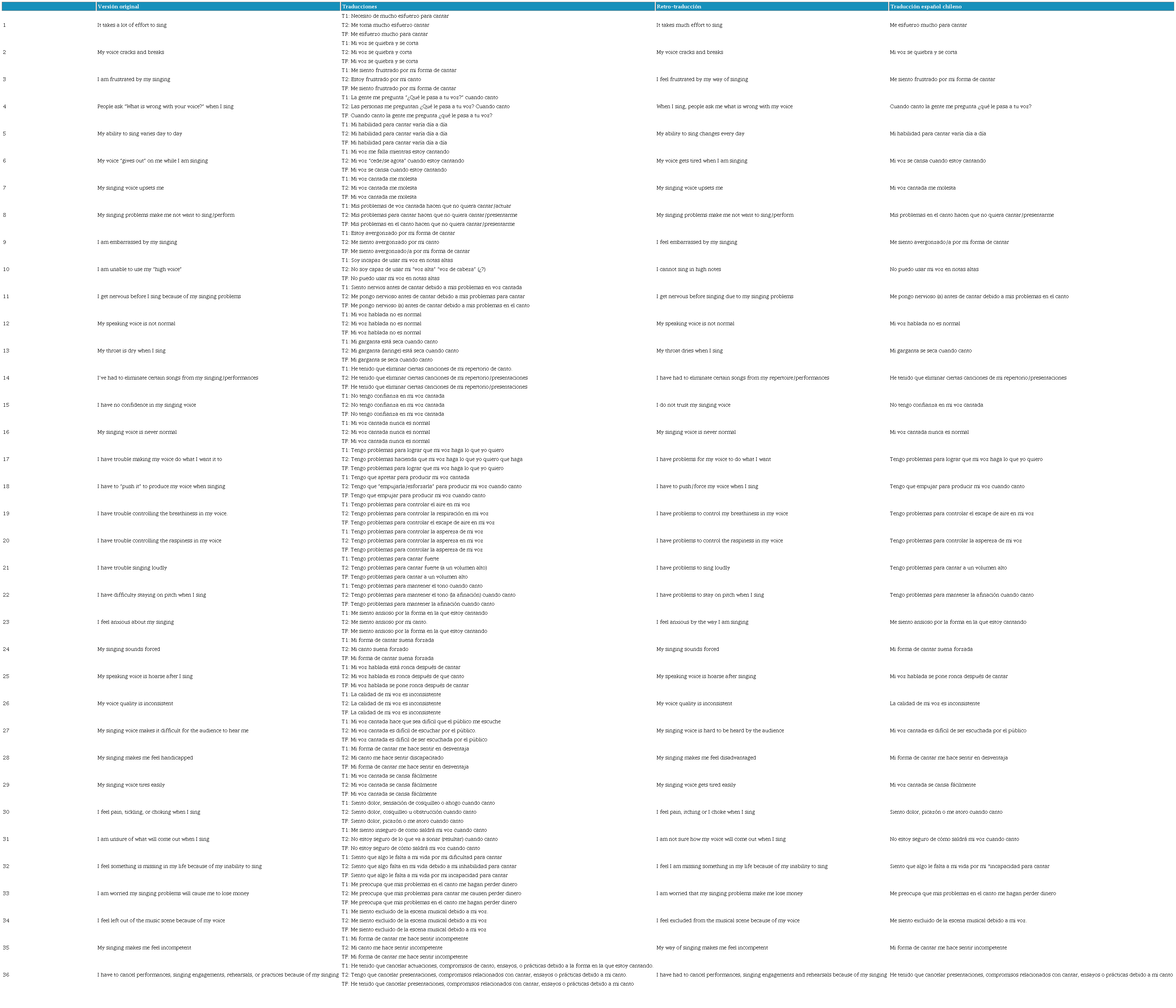 Methodology: The SVHI was directly translated into Chilean Spanish and later back-translated into the original English language; both translations were reviewed by a judgment of bilingual experts, who defined which items would make up the first version of the translated tool. This version was answered by 15 Chilean singers with a diagnosis of dysphonia, with the aim of identifying discrepancies, which were reviewed and agreed upon by the committee of experts; a second modified version was applied to 5 more singers with a diagnosis of dysphonia, not finding misunderstood or inappropriate questions for Chilean culture at this stage.