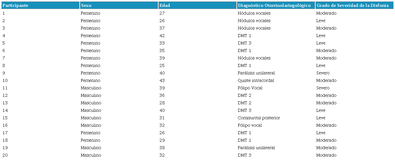 Los criterios de inclusión de los participantes fueron los siguientes: tener más de 18 años, ser de nacionalidad chilena, practicar el canto de manera profesional, acudir a terapia fonoaudiológica y tener diagnóstico de disfonía otorgado por un especialista en otorrinolaringología. Fueron invitados a participar a través de un afiche informativo ubicado en la sala de espera de su local de atención vocal, Centro de Atención Fonoaudiológico de la Universidad de Valparaíso (CAFUV). Los participantes interesados enviaron un mail a la investigadora principal, quien les envió por mail, en formato de formulario de Google®, el consentimiento informado de la investigación y la encuesta IDVC-Cl. En la Tabla 2 se describen las características de los participantes.