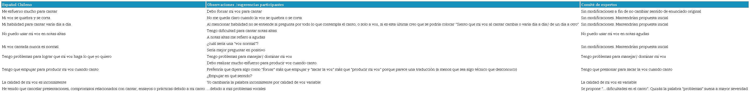 Luego de obtener las traducciones directas, ambas fueron comparadas por un comité de expertos conformado por tres fonoaudiólogos especialistas en el área de voz con mínimo cinco años de experiencia en el área y con conocimientos específicos en el área de voz cantada, y que también eran bilingües (inglés-español), certificados en el nivel C1 del examen TOEFL; ninguno de ellos participó en el proceso anterior de traducción. El comité se reunió, revisaron ambas traducciones directas, las compararon y vincularon con el SVHI, y determinaron las traducciones que fueran más similares al cuestionario original en términos de contenido; estas traducciones fueron seleccionadas y formada una única traducción, llamada traducción final (TF), la que, siguiendo el proceso establecido, fue traducida de manera inversa al inglés. La traducción inversa fue realizada por un traductor profesional con título universitario de traductor-intérprete Inglés-Español, que no participó de las etapas anteriores, no pertenecía al área de la fonoaudiología, ni conocía el cuestionario original. Posterior a esto, la versión original del protocolo SVHI, junto con la traducción inversa, fueron consideradas semánticamente equivalentes, al momento de realizar la comparación por parte del comité de expertos fonoaudiólogos anteriormente mencionado. A través del proceso descrito, se obtuvo la traducción del cuestionario llamado Índice de desventaja en voz cantada para el español Chileno (IDVC-Cl). Este proceso se encuentra detallado en la Tabla 1.