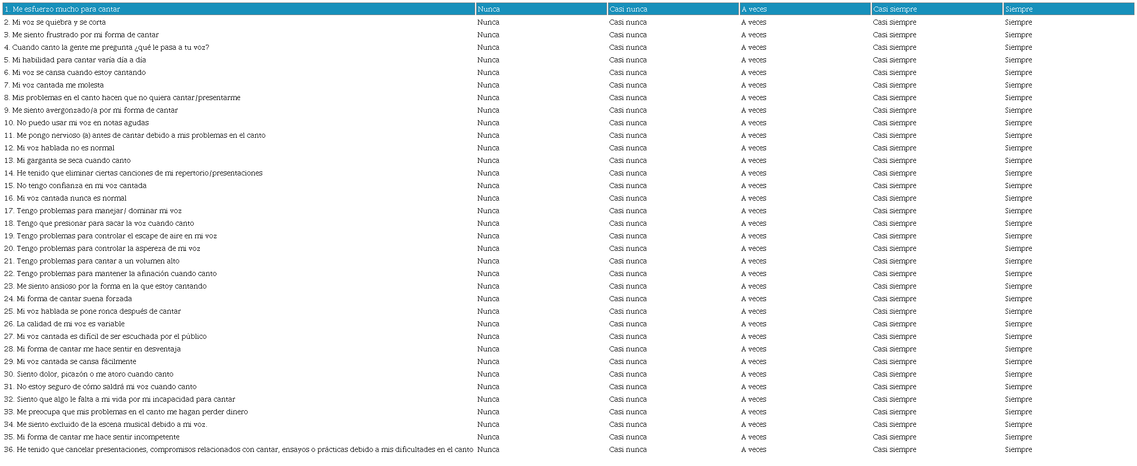 Instrucciones: Estas son declaraciones que muchas personas han usado para describir su canto y las consecuencias que ha traído a sus vidas su forma de cantar. Encierre en un círculo la respuesta que indique con qué frecuencia has tenido la misma experiencia el mes pasado.