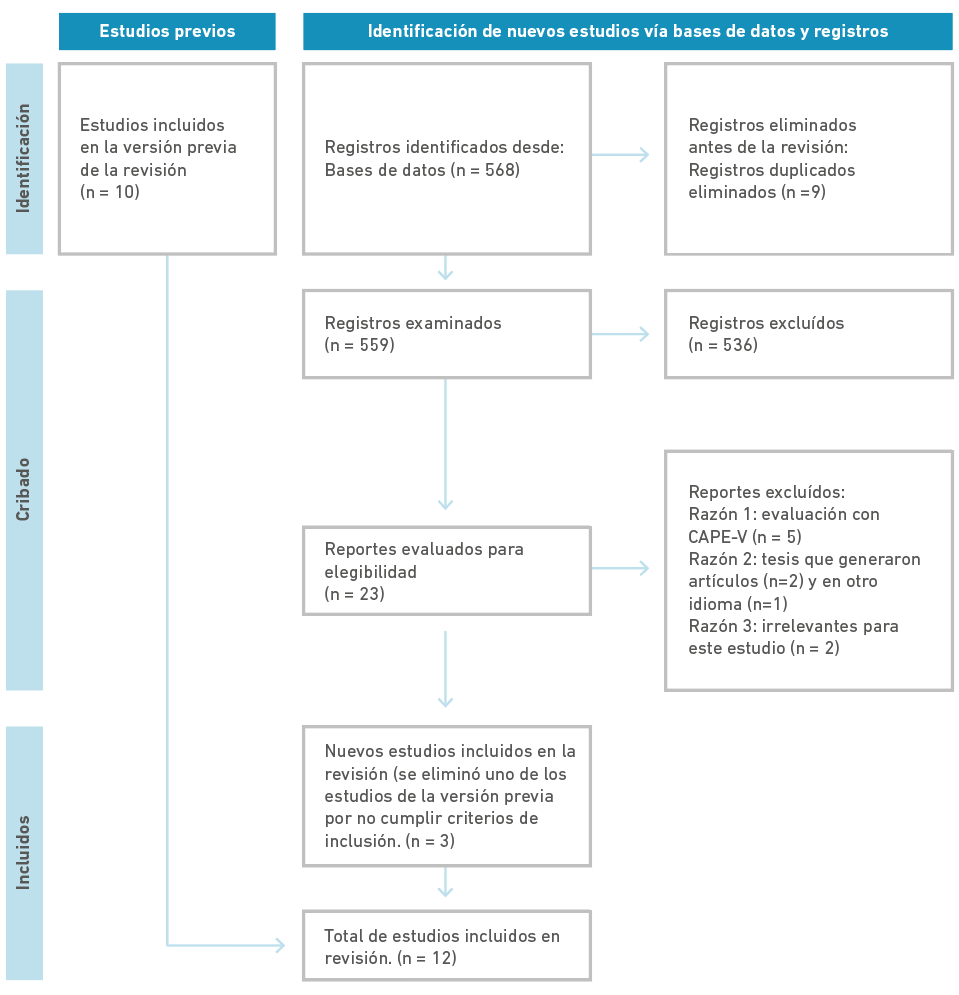 Resultados: La búsqueda inicial identificó 568 artículos. Al eliminar duplicados se revisaron 559 y 23 fueron preseleccionados. 12 se incluyeron finalmente y fueron analizados, considerando adaptación, metodología y análisis estadístico. Los resultados revelan que la adaptación y validación de CAPE-V a diversos idiomas es fundamental para garantizar mediciones precisas y confiables en diferentes poblaciones.