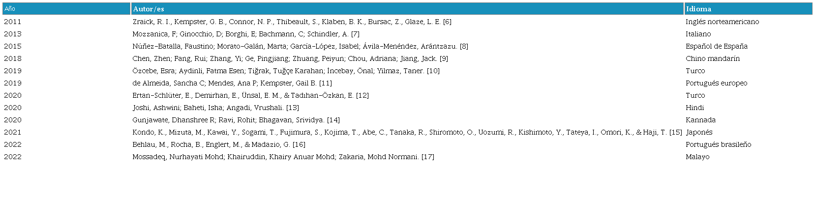 Un aspecto que llama la atención es que, dentro de la adaptación, solamente en 2 de los 9 estudios se consideró traducción directa y retrotraducción [11,17]. Al respecto, la bibliografía señala que es necesario hablar de “adaptación” más que de “traducción”, ya que este último procedimiento es parte del primero, que es mucho más amplio y que asegura que un determinado instrumento pueda, efectivamente, ser usado en una población distinta de la original. La adaptación es un proceso más complicado que involucra varias etapas, como asegurar la evaluación del mismo constructo en las culturas e idiomas implicados, elegir adecuadamente a los traductores, efectuar los cambios necesarios para que la prueba pueda usarse en el nuevo idioma, demostrar que la nueva versión es equivalente a la original, etc. [21].
