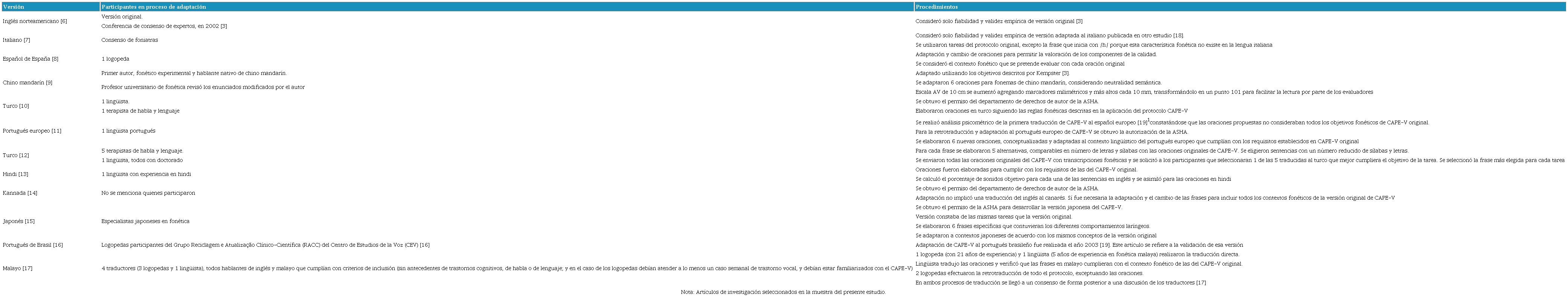 Análisis y discusión: Existe heterogeneidad en la forma de realizar la adaptación y validación de CAPE-V. No obstante, todos los estudios tuvieron éxito en producir resultados válidos, subrayando la importancia de estos procesos para la práctica clínica.