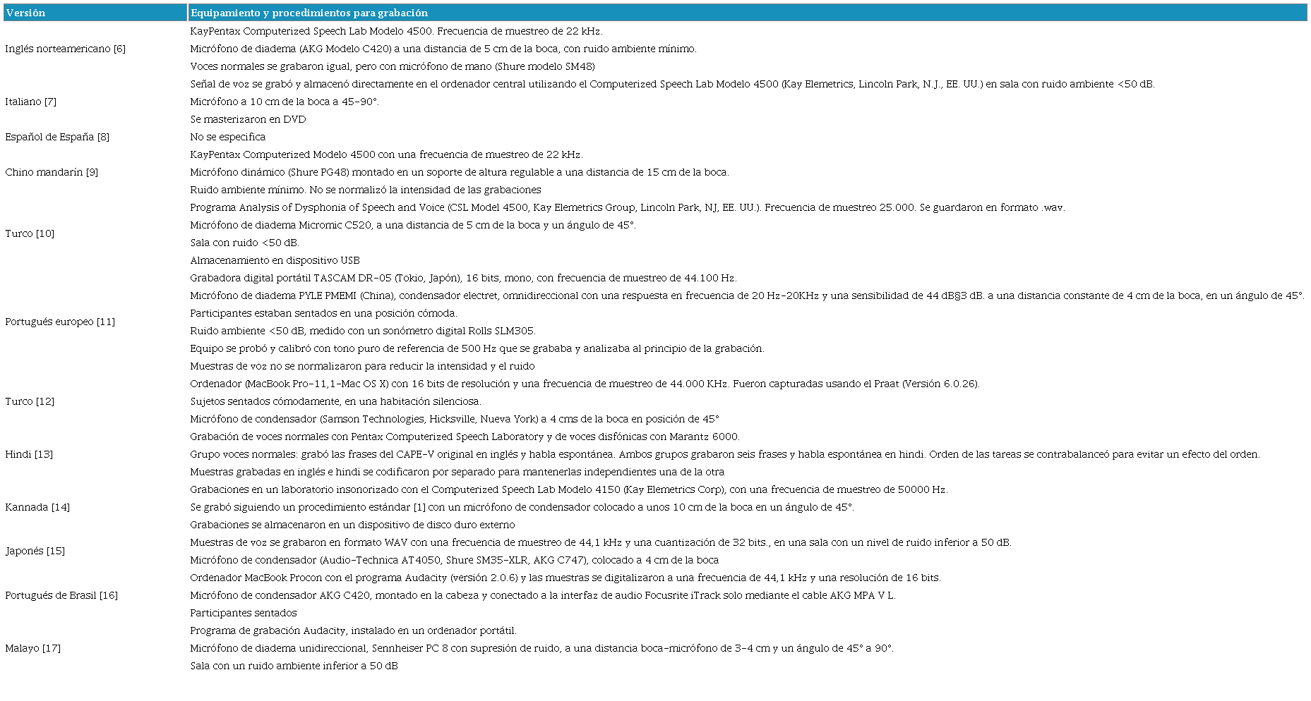 En cuanto a los procedimientos utilizados para la grabación de las muestras de voz, en 1 de los 12 estudios no se menciona nada al respecto [8]. En 5 de los 12 se usó el KayPentax Computerized Speech Lab (versiones 4500 y 4150) [6,7,9,13,14]; en otro estudio se utilizó el Analysis of Dysphonia of Speech and Voice (CSL Model 4500 [10]; en 1 de los 12 estudios se empleó una grabadora digital portátil TASCAM DR-05 [11]; y en 3 se usó un ordenador portátil, 2 con el programa Audacity y 1 con el Praat Versión 6.0.26 [12,16,17]. Finalmente, en la investigación restante no se indica en qué tipo de computador o programa se capturaron las voces [15]. En la versión hindi, en que la muestra se grabó en lugares diferentes, para las voces disfónicas se usó el Marantz 6000 [13].