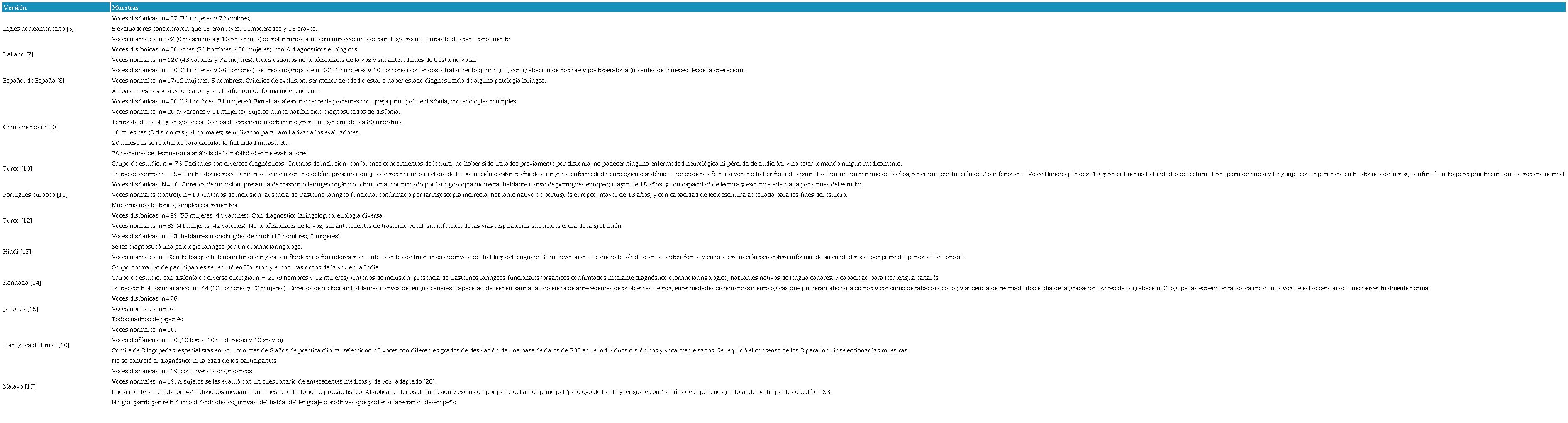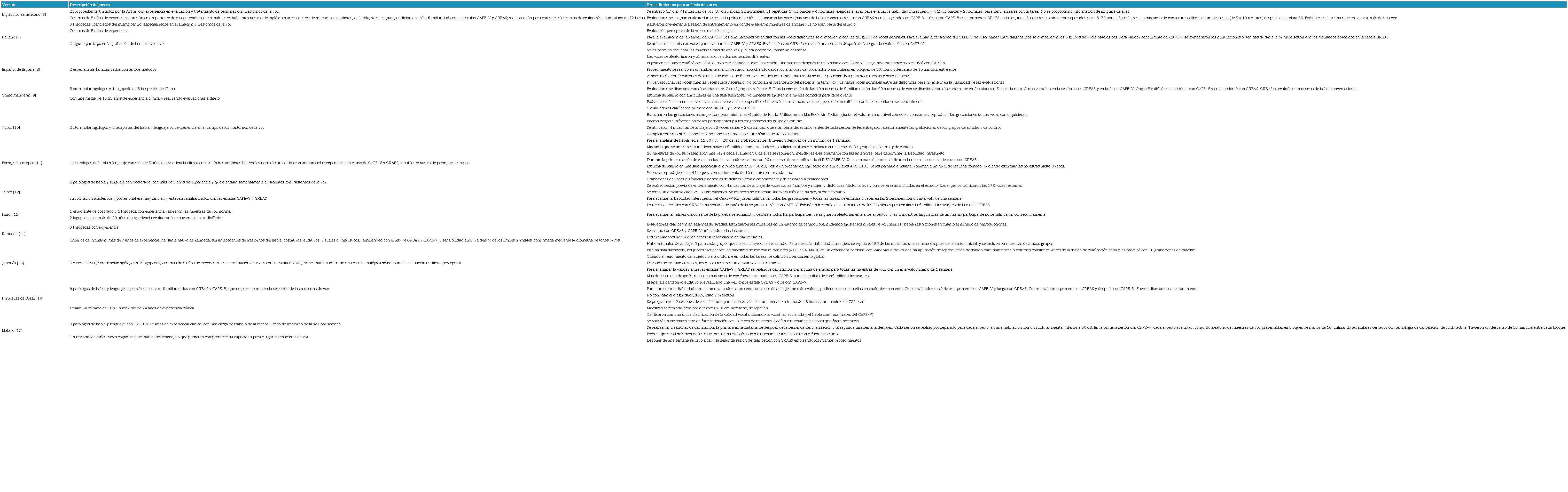 Cuando se menciona a los participantes, el número varía desde 1 a lo que es descrito como “consenso de expertos”. Con respecto a su formación, se incluyen foniatras, terapistas de habla y lenguaje, expertos en trastornos de la voz, fonéticos y lingüistas [6-13,15-17]. Solo en un caso se menciona la intervención de traductores [17].