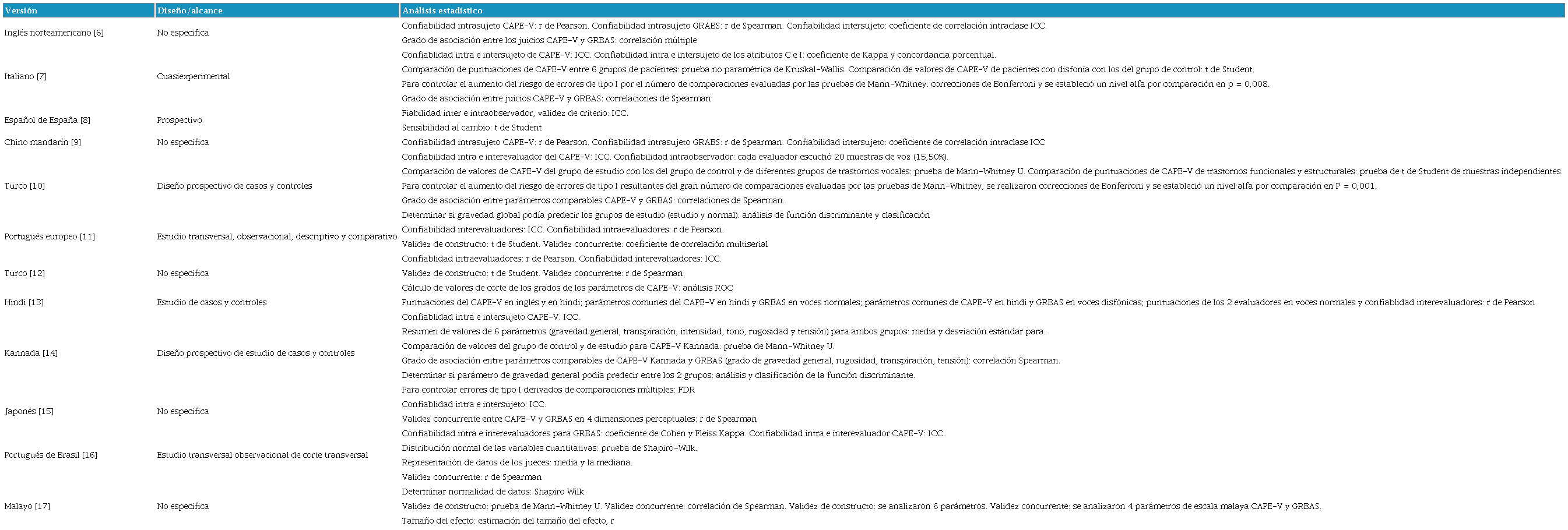 No obstante, todos los estudios analizados concluyen que la versión adaptada al idioma de CAPE-V es válida y confiable para ser utilizada en la evaluación perceptual de la voz en la respectiva población, los resultados de la revisión indican que existe gran heterogeneidad en la manera en que se llevaron a cabo la adaptación y la validación.