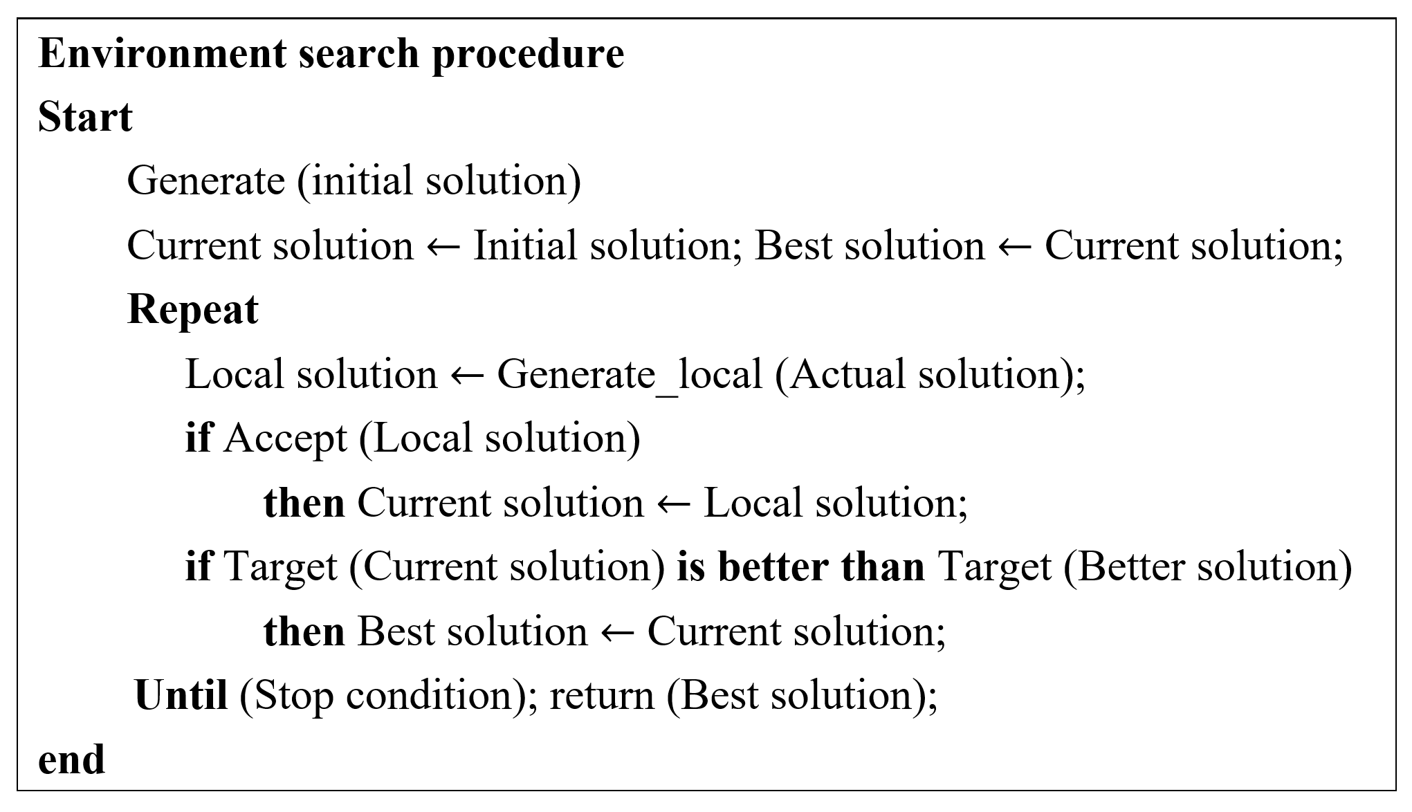 The path-based search algorithm is commonly employed in theoretical and practical investigations of search metaheuristics [51]. It involves the utilization of environment structures, which encapsulate the notion of proximity or adjacency among alternative problem solutions. The entirety of solutions falls within the environment surrounding the present solution, demarcated by a solution generation operator. Path-based algorithms conduct a localized examination of the search space, scrutinizing the environment encompassing the current solution to determine the course of the search path [52]. Establishing the environment's structure suffices to formulate a generic search algorithm model [51]. To instantiate the algorithm, encoding for the solutions is specified, and a neighbor generation operator is defined, consequently establishing an environment structure for the solutions. Subsequently, a solution is selected from the environment of the current solution until the termination criterion is satisfied [53].