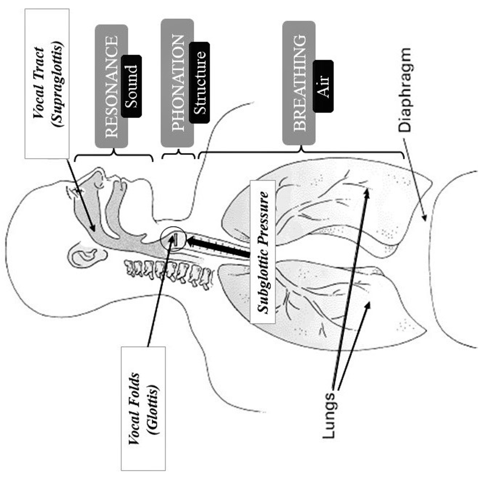 Voice production involves the integration of three physiological processes: breathing, phonation, and resonance, allowing for the analysis of aerodynamic, mechanical, and acoustic phenomena within this framework [1,2]. In general terms, sound production is a complex nonlinear process involving air-structure-sound interaction: pulmonary pressure (subglottic pressure) generates airflow, which in turn interacts with the glottis, the region where the vocal folds converge to initiate vibration as a result of the interplay between air and the surrounding tissues and mucosa [3,4]. The quality of sound production is significantly influenced by the airflow [5]. Under optimal physiological and geometrical conditions, the interaction between the airflow and the vocal folds leads to a self-oscillation effect [6,7]. Consequently, the airflow affects glottal geometry, and the biomechanical properties of the vocal folds bring about alterations in the conversion of this airflow into sound, ultimately influencing the quality and acoustic attributes of the voice (i.e., the voice's characteristics depend on the interplay between flow and structure) [8]. Finally, the sound generated in the glottis is modified in the supraglottic cavities, so the concept of vocal tract inertance also contributes to this self-oscillation [2] (see Figure 1).