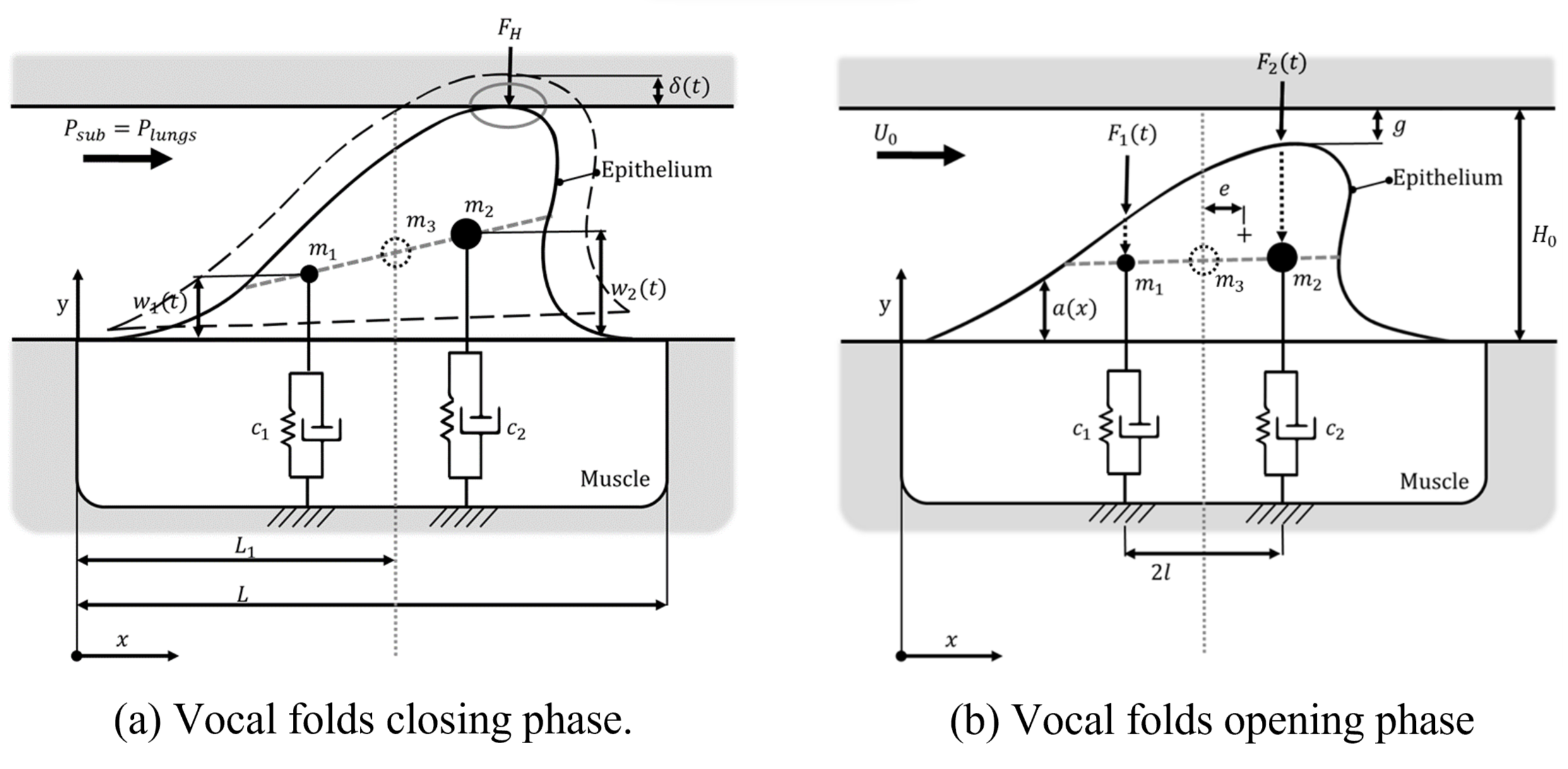 Given the complexity of this field, research has primarily focused on comprehending the various physical phenomena of vocal production through biomechanical modeling. In the literature, models of varying complexity have been developed to represent vocal fold tissues, incorporating lumped elements to depict acoustic wave signals and one-dimensional airflow [9,10]. Also, models of greater complexity, with a representation of computational fluid dynamics and high-fidelity, have been proposed [1].