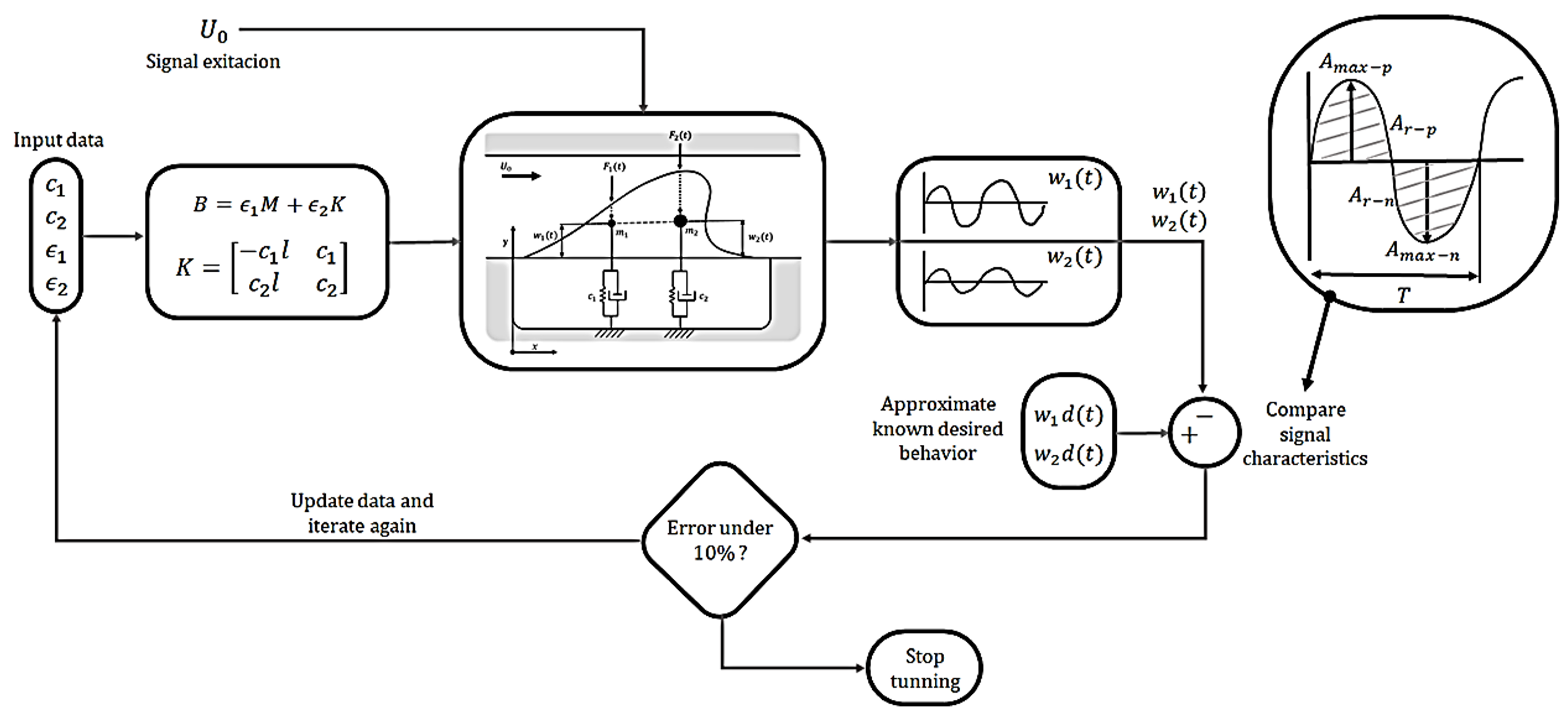 The evaluation of the tuning process's performance was conducted by considering features of the target signal, including the period (T), positive maximum amplitude (Amax-p), negative maximum amplitude (Amax-n), positive section area (Ar-p), and negative section area (Ar-n). The appropriate moment to conclude the simulation is determined by the algorithm through an assessment of the discrepancies between the previously acquired characteristics and the desired ones. A margin of error of at least 10% was established, at which point the algorithm decides to conclude the metaheuristic search or update the data with new combinations, effectively restarting the simulation.