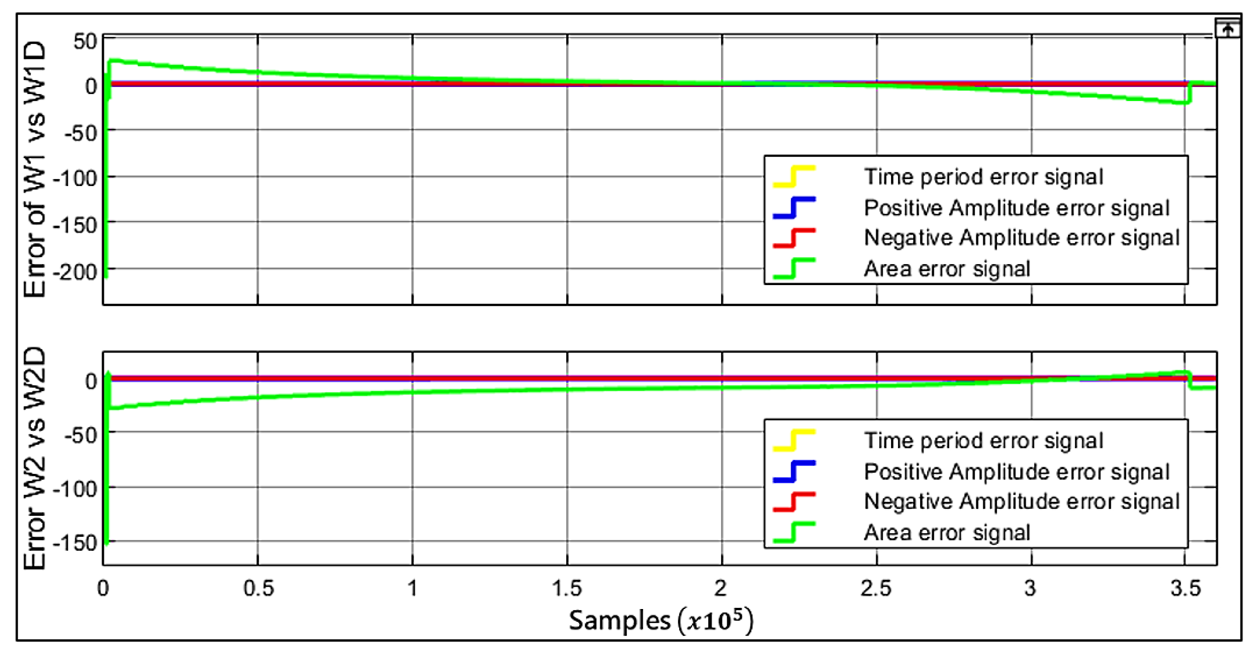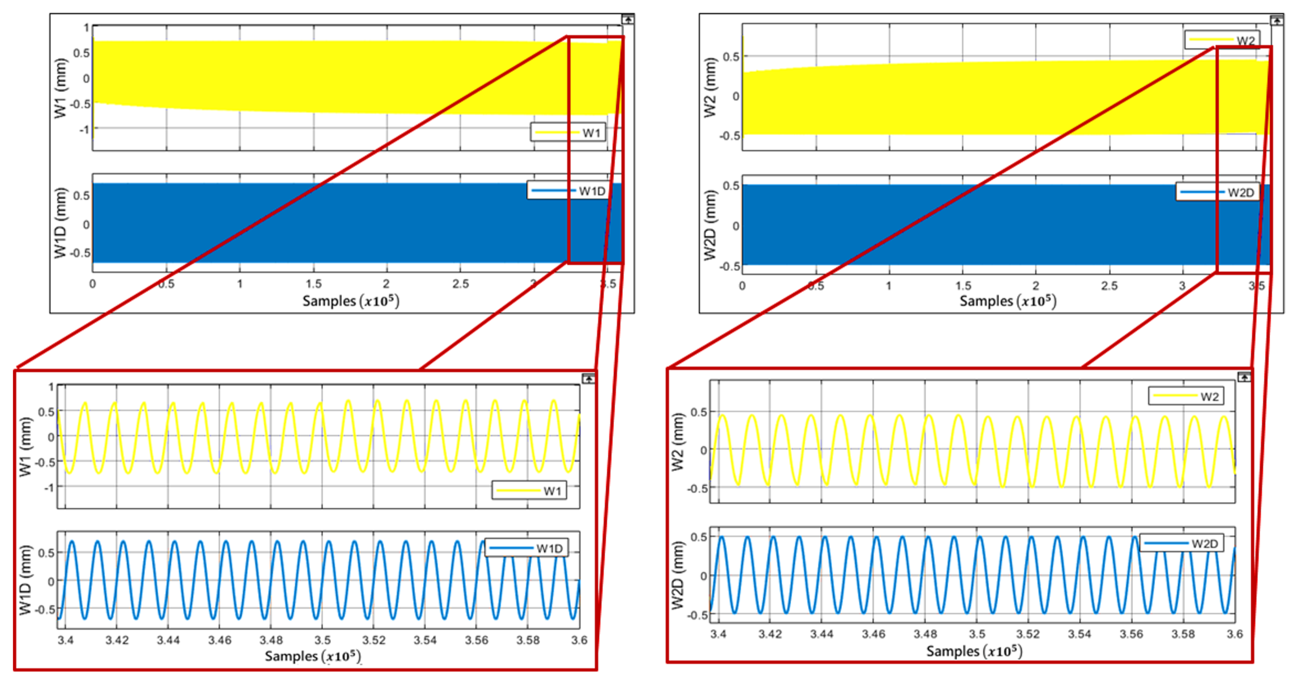 After approximately 360,000 iterations of possible combinations, the algorithm was halted to refine the coefficients of the model. The fine-tuning of the model is manifested in the vertical displacements of the masses represented by and m2. It is noteworthy that the signals acquired W2 and W2 closely align with the desired signals W1D and W2D, particularly between samples 340,000 to 360,000, as illustrated in Figure 4.