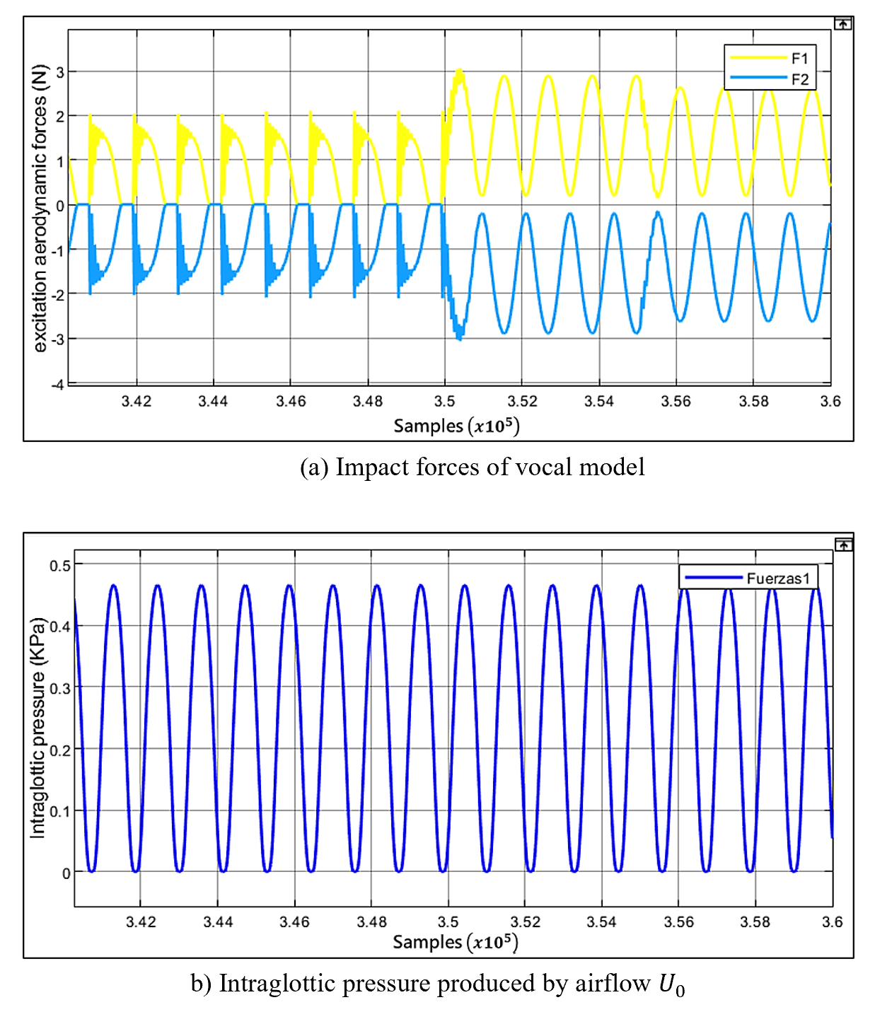In the simulation processing time, fine-tuning took approximately 3.6 to 5 seconds on an Intel(R) Core (TM) i5-10210U CPU @ 2.11 GHz machine. A fixed simulation step factor of 0.00001 was employed, considering that oscillations typically range between 100 and 200 Hz. The parametric adjustment facilitated the acquisition of interaction forces exciting the vocal model. Figure 6a illustrates the excitation force curves of the mechanical vocal model in the final moments of the simulation, wherein the parameters approach their minimum error. It is noteworthy that starting from sample 350000, the forces exhibit sinusoidal coupling and adapt in accordance with the naturally obtained parameter conditions at this iteration instant.
