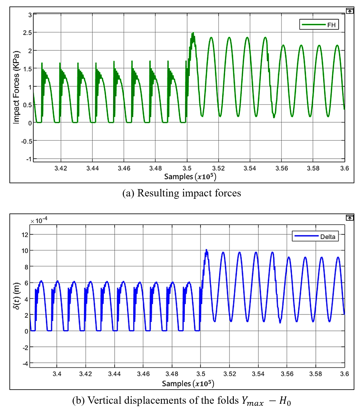 The iterations of this algorithm were terminated upon reaching an error threshold of 10% or less for the evaluated features in the model signals. Table 1 presents the parametric modifications that the input variables underwent throughout the simulation. It is worth noting that the parameter ϵ 1 remained unchanged in its tuning, as dictated by the inherent nature of the mechanical model, wherein the dynamics primarily center around the forces generated by the viscous components rather than the mass of the fold.