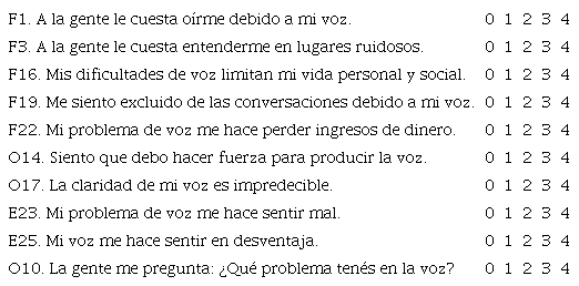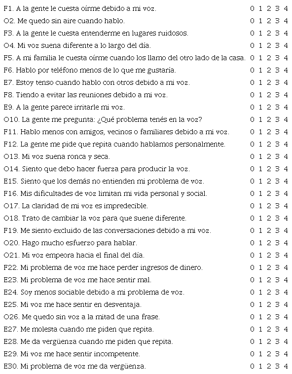 Las subescalas del VHI original (functional, physical, and emotional) fueron adaptadas como “funcional”, “orgánica” y “emocional”, por lo que las letras que preceden a cada ítem del índice adaptado son F, O y E, según corresponda.