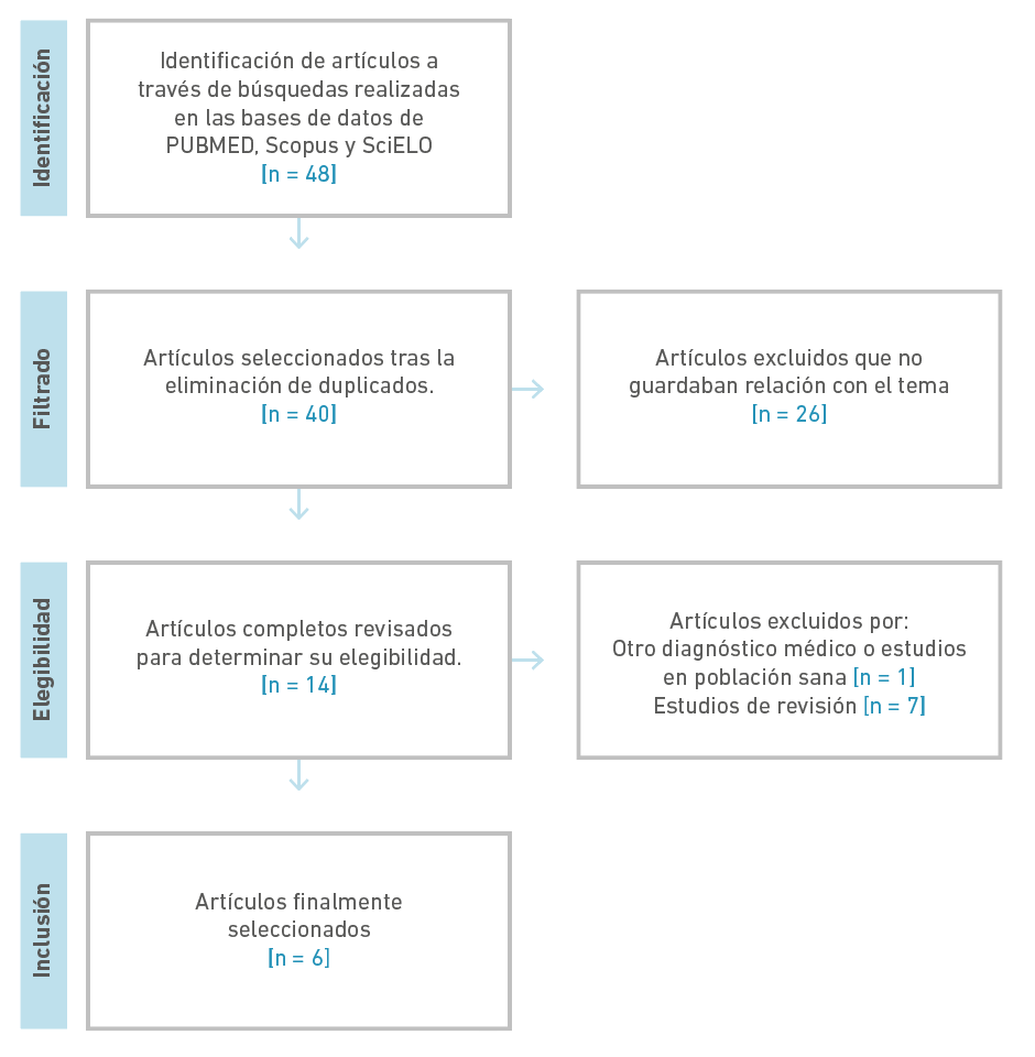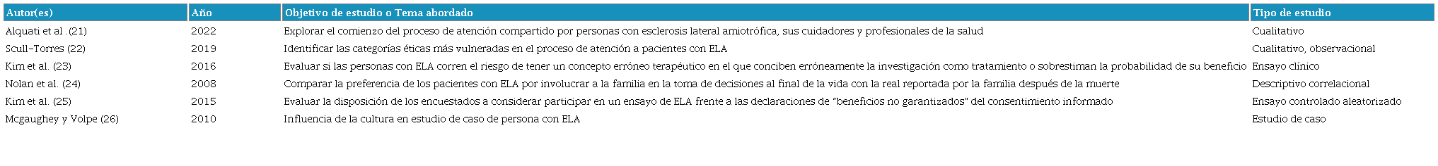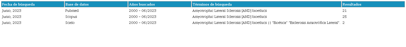 Para alcanzar el objetivo de conocer aquellas consideraciones bioéticas en el manejo y estudio de personas con ELA, se realizó una búsqueda bibliográfica siguiendo las recomendaciones descritas por Green et al. para revisiones narrativas [20]. Se efectuó una búsqueda bibliográfica en las bases de datos PubMed, Scopus y SciELO, utilizando los términos MeSH “Amyotrophic Lateral Sclerosis” y “bioethics” con el booleano de intersección “AND”. También fueron utilizados los términos deCS “Bioética” y “Esclerosis Amiotrófica Lateral”. Se filtraron artículos publicados desde 2000 hasta junio de 2023 (Tabla 1) y fueron seleccionados aquellos que abordaban algún componente bioético en el manejo en población con ELA. Se excluyeron artículos que no eran afines al tema central de estudio y aquellos artículos que correspondían a revisiones o a comentarios de opinión.