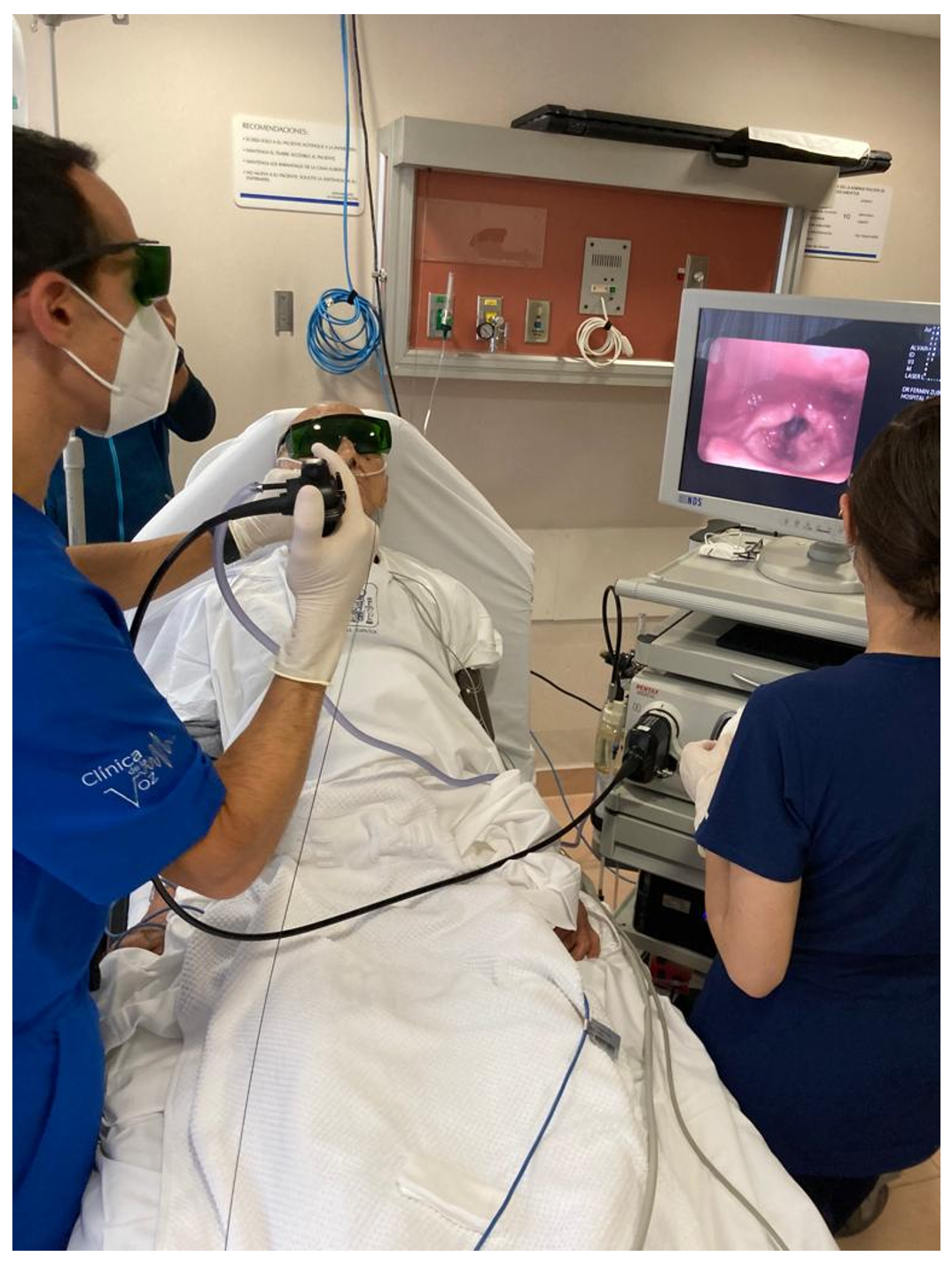 After general anesthesia was introduced for the first time in 1846, the main way laryngeal procedures were done was through direct microlaryngoscopy in the operating room [21]. Thanks to technological advances, specifically in rigid and flexible endoscopy, in-office procedures have become a well-accepted alternative that has gained increased popularity. Fortunately, a great number of laryngeal diseases can be treated in the office or endoscopy suite with patients under superficial sedation or local anesthesia, lowering procedure time and costs compared to the operating room. The possibility of performing a procedure in an awake patient also provides efficient time management during daily activities for the surgical team with outpatient office visits, follow-ups, and operating room scheduling.