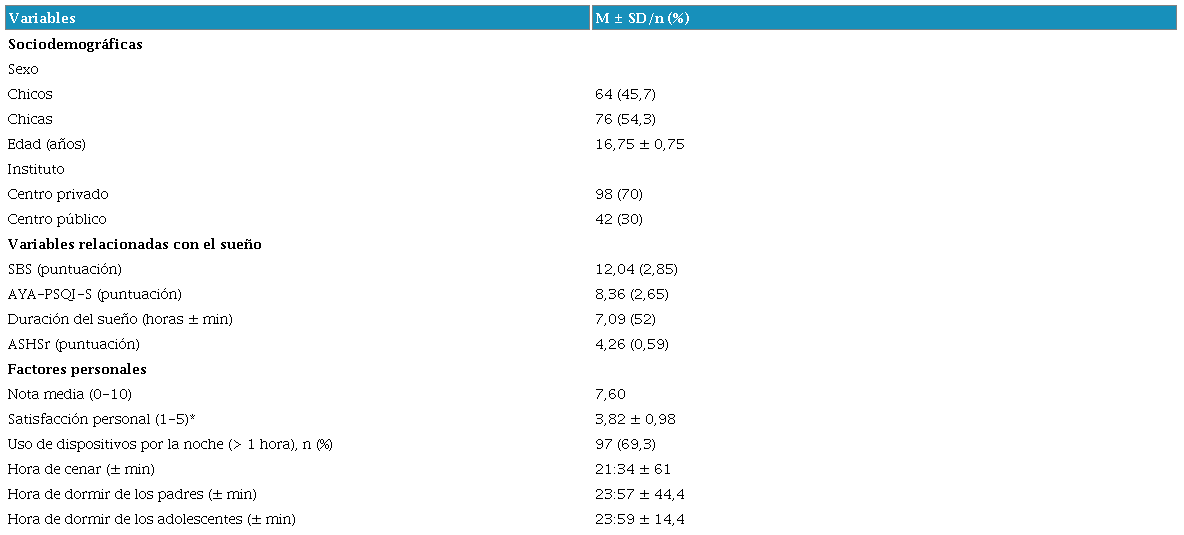 Asimismo, se añadieron cuestiones sociodemográficas y otras relacionadas con los factores de relevancia para el estudio del sueño (17 ítems): sexo, edad, curso, tiempo de uso de dispositivos electrónicos por la noche (móvil, tableta, ordenador, consola), ejercicio físico, satisfacción personal, nota media en el último curso, hora de cenar y hora de dormir de los padres.
