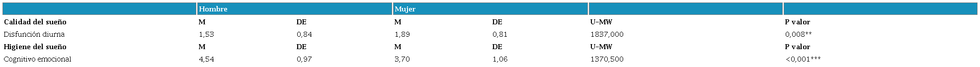 Por otra parte, la calidad del sueño de las mujeres (M = 8,70; DE = 2,72) fue peor respecto a la de los hombres (M = 7,97; DE = 2,55), con una significativa (p < 0,05) disfunción diurna (M = 1,53; DE = 0,84) y un peor cuidado del factor cognitivo-emocional (M = 3,70; DE = 1,06), como se indica en la Tabla 2.