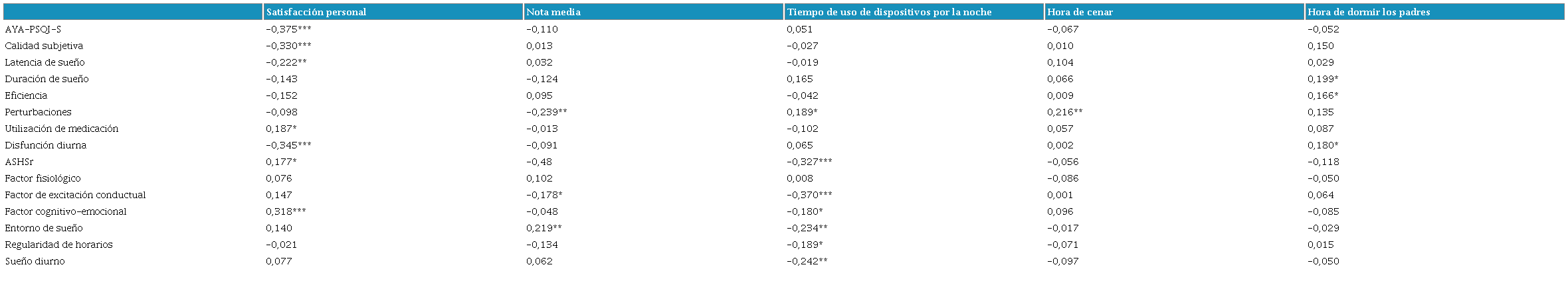 Se observó la relación estadísticamente significativa (p < 0,05) entre la calidad del sueño e higiene del sueño globales (Rho = - 0,405; p < 0,001). Los jóvenes con puntajes más elevados en la escala de higiene del sueño son aquellos que puntuaron más bajo en el AYA-PSQI-S (mejor calidad del sueño autorreportada).