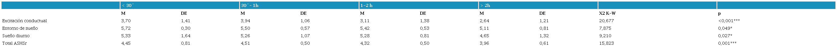 Adicionalmente, la hora a la que se acuestan los padres influía en las dimensiones de la duración de sueño (Rho = 0,199; p = 0,018), la eficiencia de sueño (Rho = 0,166; p = 0,050) y la disfunción diurna (Rho = 0,180; p = 0,033).