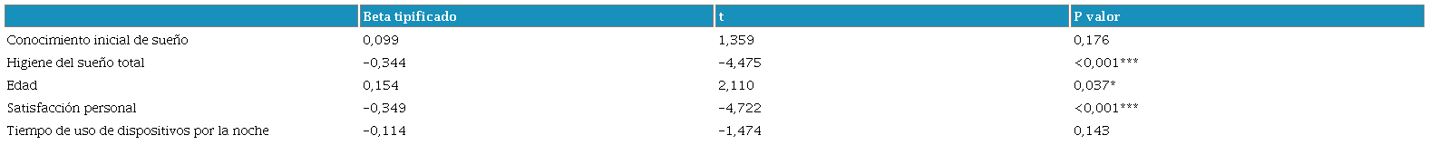 La calidad del sueño fue explicada en un 28,4% por el conocimiento inicial en sueño, la higiene del sueño, la edad, la satisfacción personal y el uso de tecnología por la noche. Sin embargo, al analizar la significancia estadística (p < 0,05) de las variables independientes respecto a su influencia en la variable dependiente (calidad del sueño total), se observó que esta recaía únicamente en la higiene total (β = - 0,344), la edad (β = 0,154) y el autoconcepto (β = - 0,349), como se detalla en la Tabla 6.
