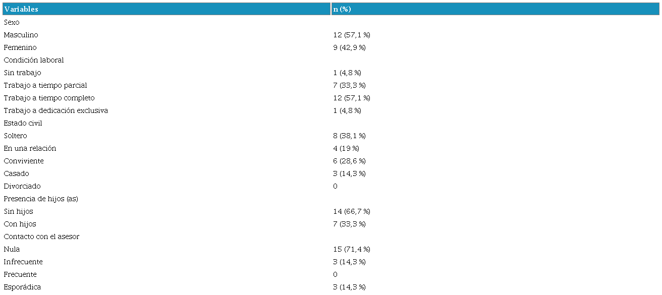Participaron 21 graduados. El 57,1 % (n = 12) fueron varones. El promedio de edad fue 30, 25 ± 1,75 (mínimo: 27; máximo 36). El tiempo promedio desde que dejaron de elaborar la tesis fue 10,5 ± 2,4 meses (Tabla 1).