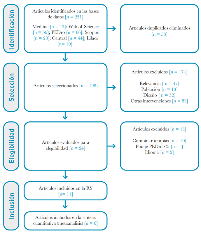 Metodología: Se realizó una revisión sistemática y metaanálisis con búsqueda electrónica en MEDLINE, WoS, SCOPUS, PEDro, CENTRAL y LILACS.