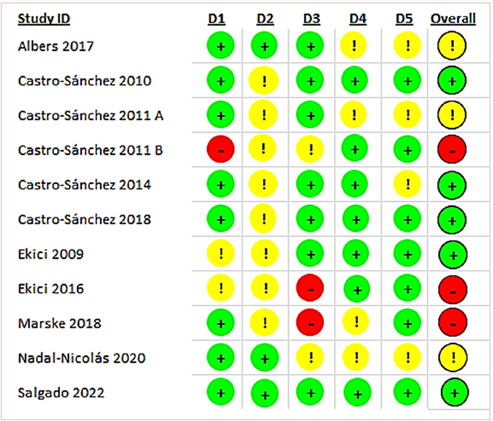 La evaluación se realizó de acuerdo a las recomendaciones del Manual de la colaboración Cochrane [33] y se utilizó la herramienta Risk of bias 2.0 (RoB 2) [35]. Esta herramienta evalúa el riesgo de sesgo a través de seis dominios: sesgo derivado del proceso de aleatorización, sesgo debido a desviaciones de las intervenciones previstas, sesgo debido a la falta de datos de los resultados, sesgo en la medición de los resultados, sesgo en la selección de los resultados comunicados y sesgo global. Cada uno de estos aspectos puede categorizarse como “bajo riesgo de sesgo” (color verde), “algunas preocupaciones” (color amarillo) o “alto riesgo de sesgo” (color rojo). Dos revisores independientes realizaron la evaluación del riesgo de sesgo de los estudios incluidos (SR-D y VS-A) y un tercer revisor fue involucrado en caso de desacuerdo (CC-M).