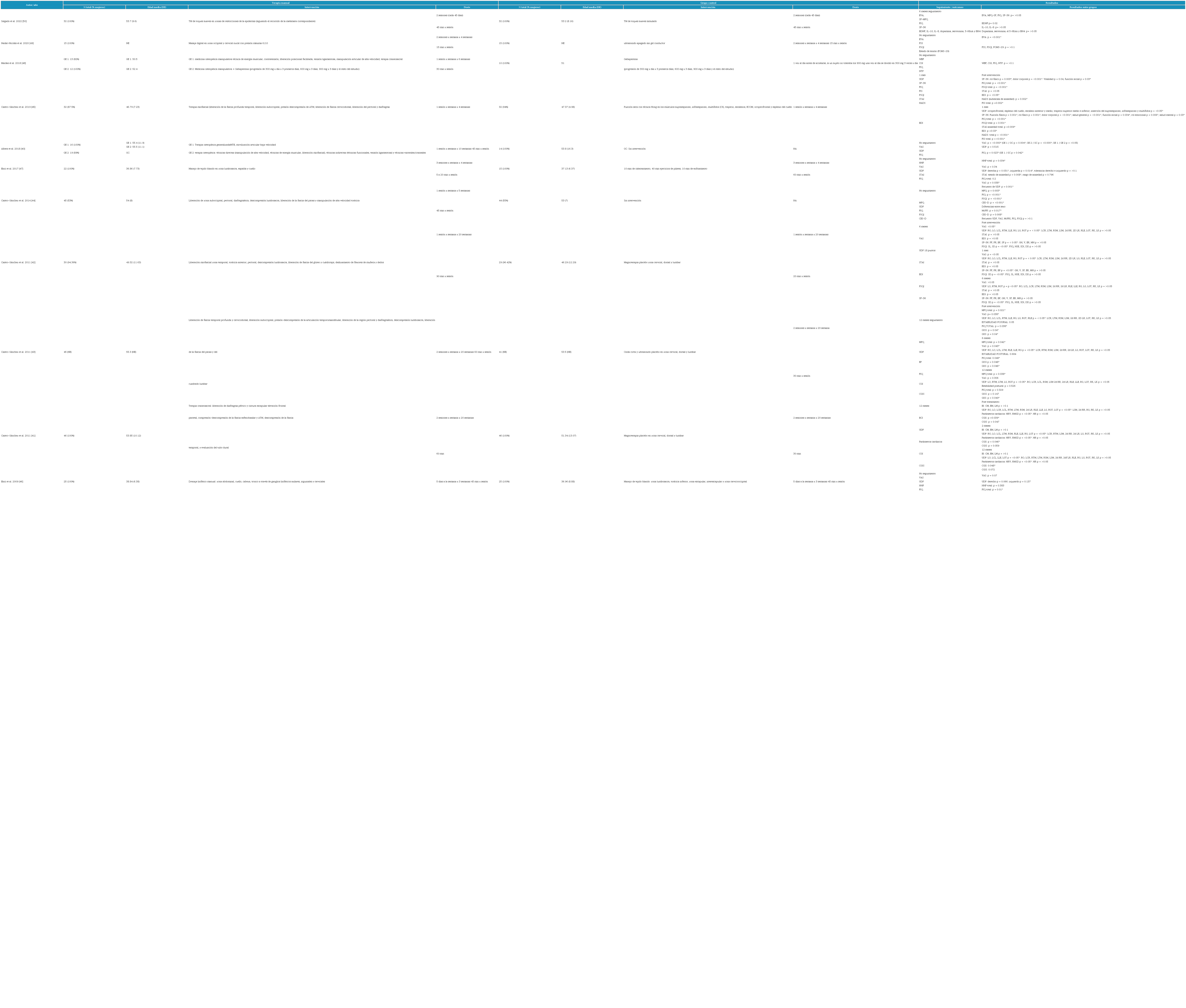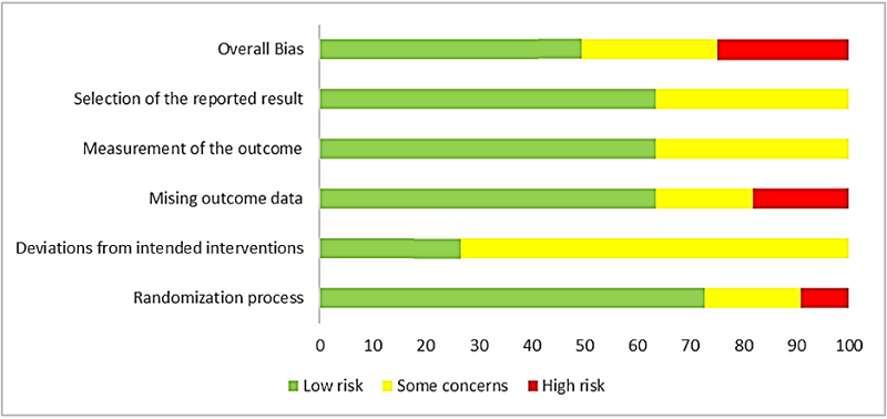 La evaluación RoB 2 para los estudios incluidos se muestra en las Figuras 2 y 3. Para el sesgo global, 50% de los estudios clínicos presentaron la clasificación de bajo riesgo de sesgo [41,44-46,50], el 25% obtuvo una clasificación de algunas preocupaciones [40,42,49] y el otro 25% una clasificación de alto riesgo de sesgo [43,47,48]. En cuanto al proceso de aleatorización, el 72.7% de los estudios obtuvieron una clasificación de bajo riesgo de sesgo [40-42,44,45,48-50]. En cuanto a las desviaciones de las intervenciones previstas, el 72.7% de los ensayos obtuvo una clasificación de algunas preocupaciones [41-48]. En relación a la falta de datos de los resultados, el 63,6% de los ECAs se calificaron con un bajo riesgo de sesgo [40-42,44-46,50]. Por último, para el criterio de los resultados comunicados, el 63,6% obtuvo una clasificación de bajo riesgo de sesgo [41,43,45-48,50].